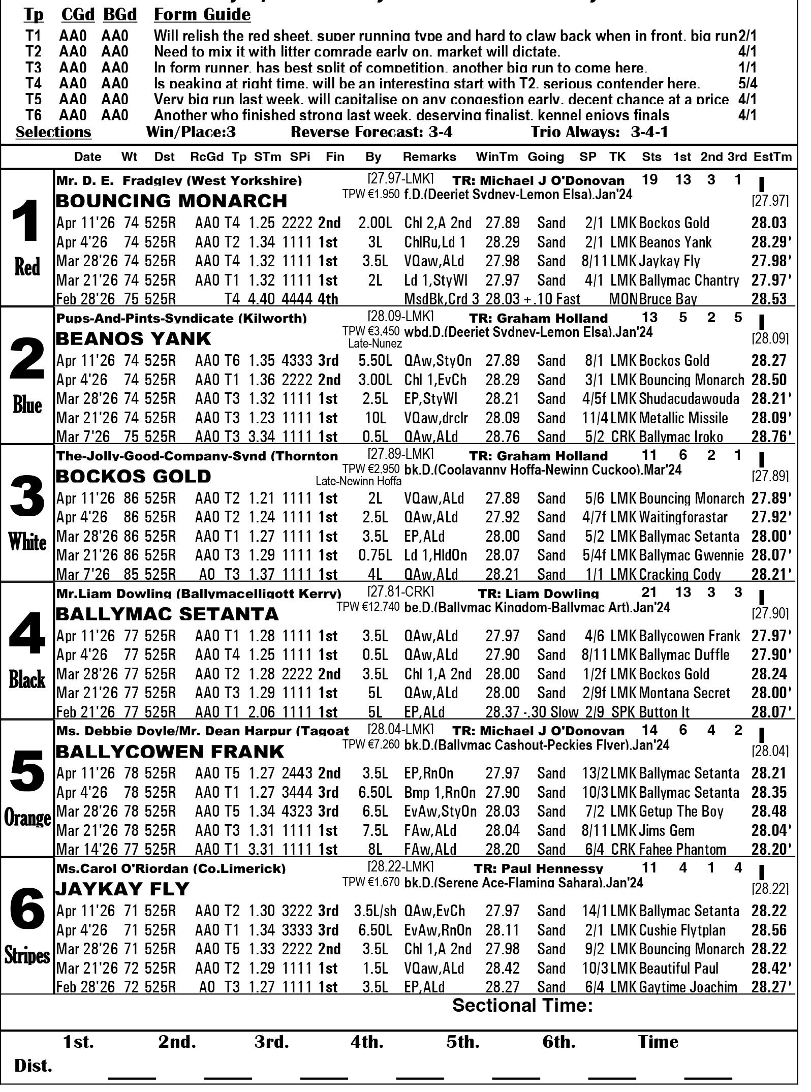 As we arrive at the final of this hugely valuable and prestigious contest, it is clear that this year’s Con & Annie Kirby Memorial has produced a decider of exceptional depth. A case can be made for multiple outcomes, and the trap draw has only heightened that intrigue, with early pace evident across the line-up. With so much speed on show, the opening yards are certain to prove decisive. Bockos Gold brings an unbeaten record into the final and is bidding to provide Graham Holland with a fourth Kirby success in just five years. The powerful 86-pounder has been the standout on the sectional clock throughout the competition, his remarkable 1.21 split setting a benchmark no rival has matched. That level of early pace suggests he is the most likely leader, but the draw presents significant challenges. Flanked by pace on all sides, notably Bouncing Monarch in trap one, Beanos Yank in two, and Ballymac Setanta in four, there is clear potential for crowding into the opening bend. In such a scenario, a clean break becomes paramount, and even the smallest hesitation could prove costly. On balance, the vote goes to Bouncing Monarch. Representing UK owner Dave Fradgley, he is ideally housed on the inside and is the one that will be happiest with the draw. A noted rails runner, he is expected to drive the inside line aggressively on the run-up and apply immediate pressure to his rivals. While overcoming the physical presence and raw pace of Bockos Gold is no straightforward task, he has shown both determination and racecraft throughout the competition and may be best placed to capitalise if the contest becomes congested early.