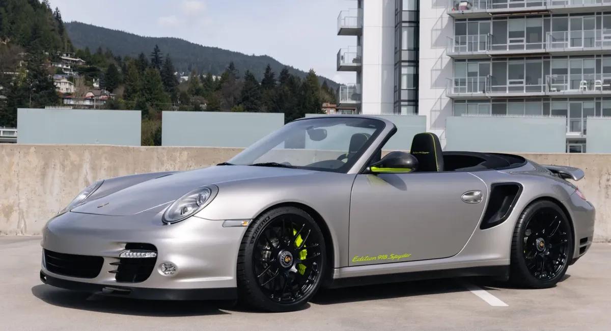 This 2012 Porsche 911 Turbo S Cabriolet Edition 918 Spyder is a Canadian-market example showing just 13k kilometers (~8k miles). Finished in Silver, it features the signature Acid Green accents unique to the Edition 918 Spyder, including badging and trim details. Modifications include an aftermarket SharkWerks center muffler bypass and a set of HRE 19″ center-lock wheels, which add a more aggressive appearance and soundtrack. With low mileage and subtle upgrades, it remains a rare and desirable counterpart to the 918 Spyder itself.
