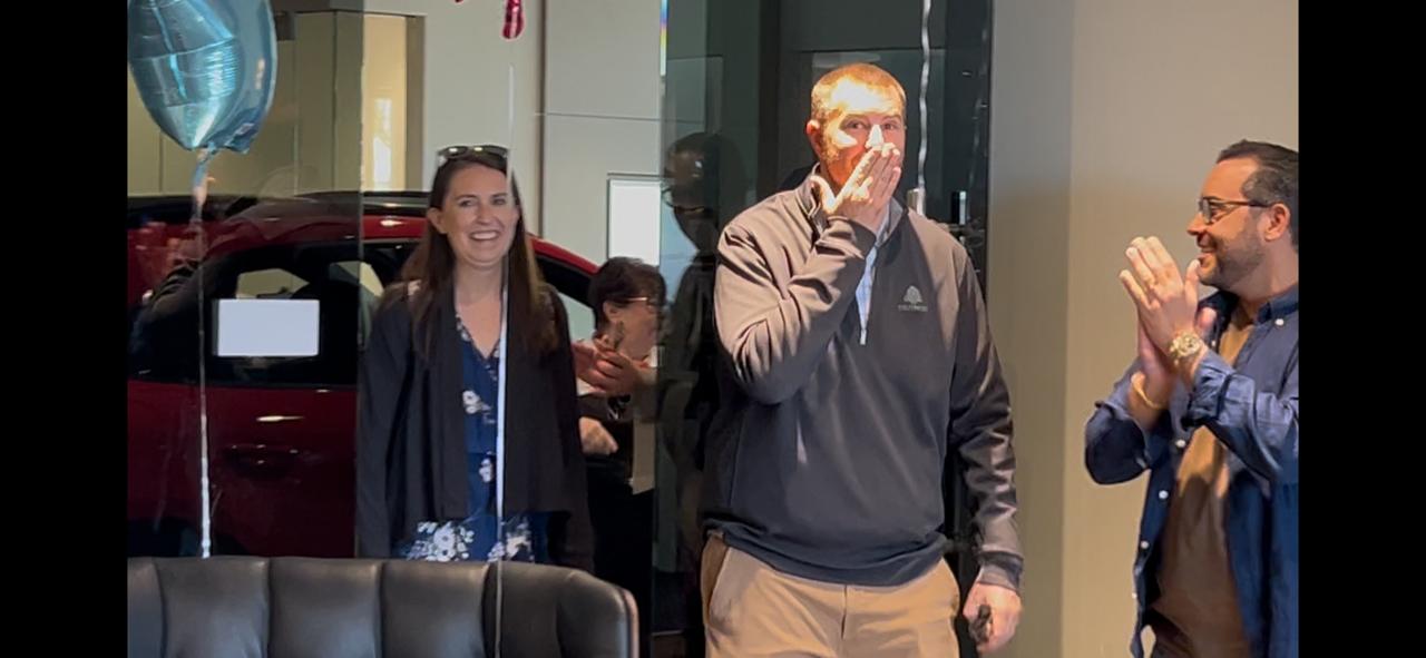 The reveal happened on Sunday, January 25th . Michael and Angela Manente, Assistant Editor, met Eric and Shaelyn at PNS for casual conversation and then moved to the conference room, overlooking the service area. Angela conducted a staged “Meet a Member” interview for Going Places feature. Michael took a few pictures and excused himself so he could orchestrate the arrival of the Board and Chair members and work with the dealership staff to set up reveal surprise. Once everything was in place, Michael came back up to the conference room just as Angela was also wrapping up the interview.