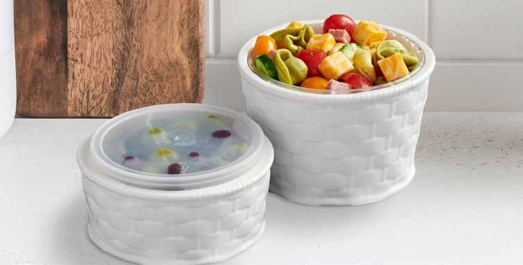 Contenedores de delicatessen - Juego de 2. Make your deli food seem homemade by disguising them with these basket weave design containers! Dishwasher safe. 8 oz. holder approx. 2-1/2” H x 5-1/4” Dia. 16 oz. holder approx. 3-1/2” H x 5-1/4” Dia.