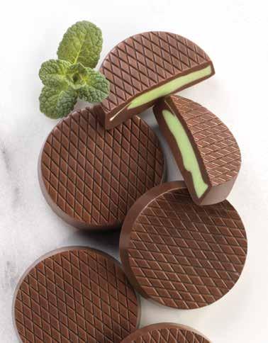 Chocolates con centro de menta. Tasty little wheels of rich dark chocolate, each overflowing with smooth green mint filling. 6 oz. Contains: *