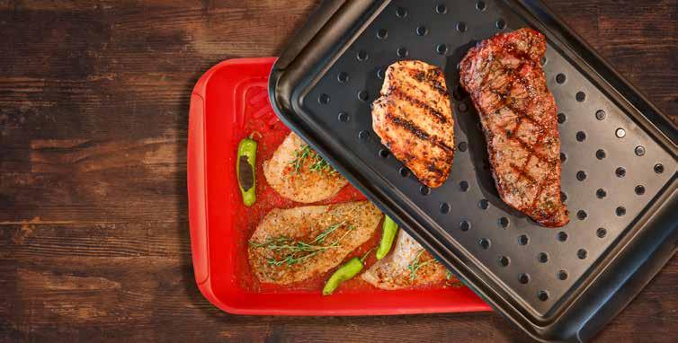 Bandeja para marinar y servir. A must-have grilling tray to keep foods safe. Use the red one to prepare and marinate raw meat then use the black one after it is cooked! Melamine. Dishwasher safe. Approx.10" H x 17" W x 10-1/2" D.