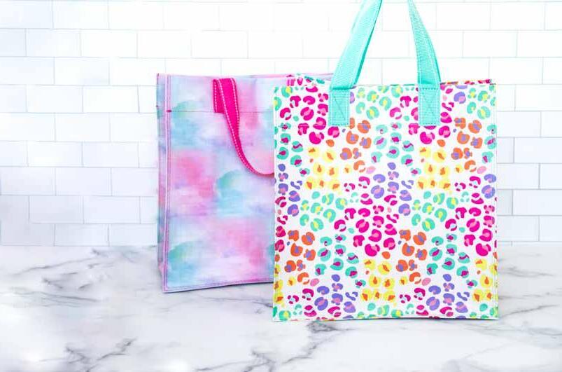Bolso shopperjuego de 2. These bags are the perfect size for a quick drug store run. Set up two with two different designs and perfect to leave in your car so you always have them with you! Approx. 13" H x 10" W x 5-3/4" D.