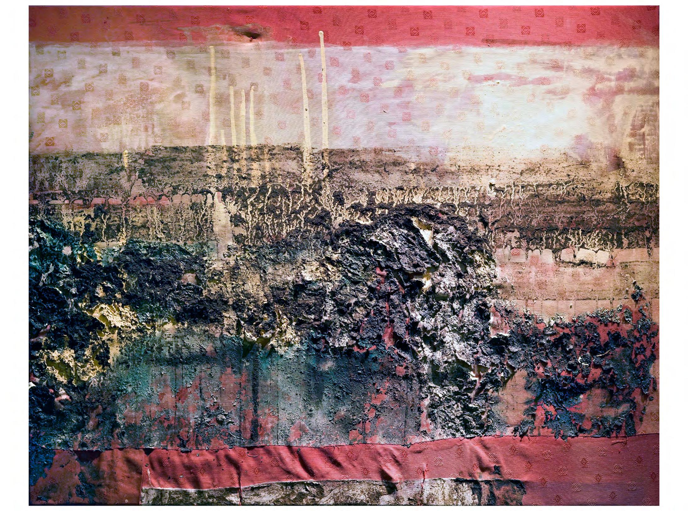 Those samples - peat, clay, water, and moss - are mixed with oils, acrylics, commercial matte paints, and discarded domestic fabrics: sheeting, wallpaper, even old clothing.