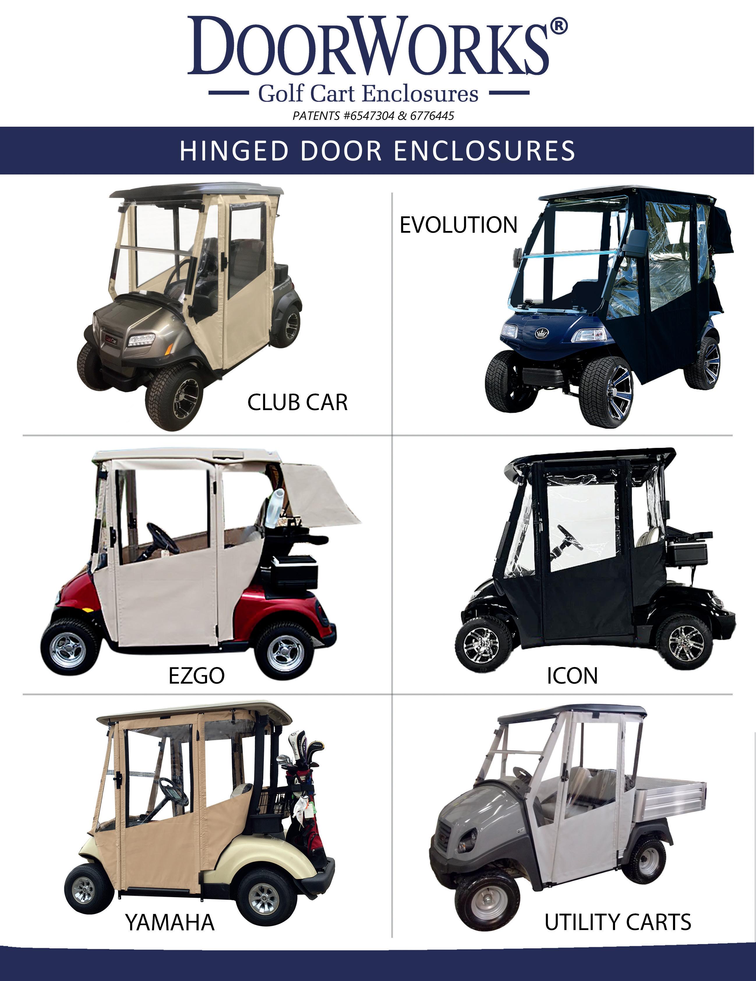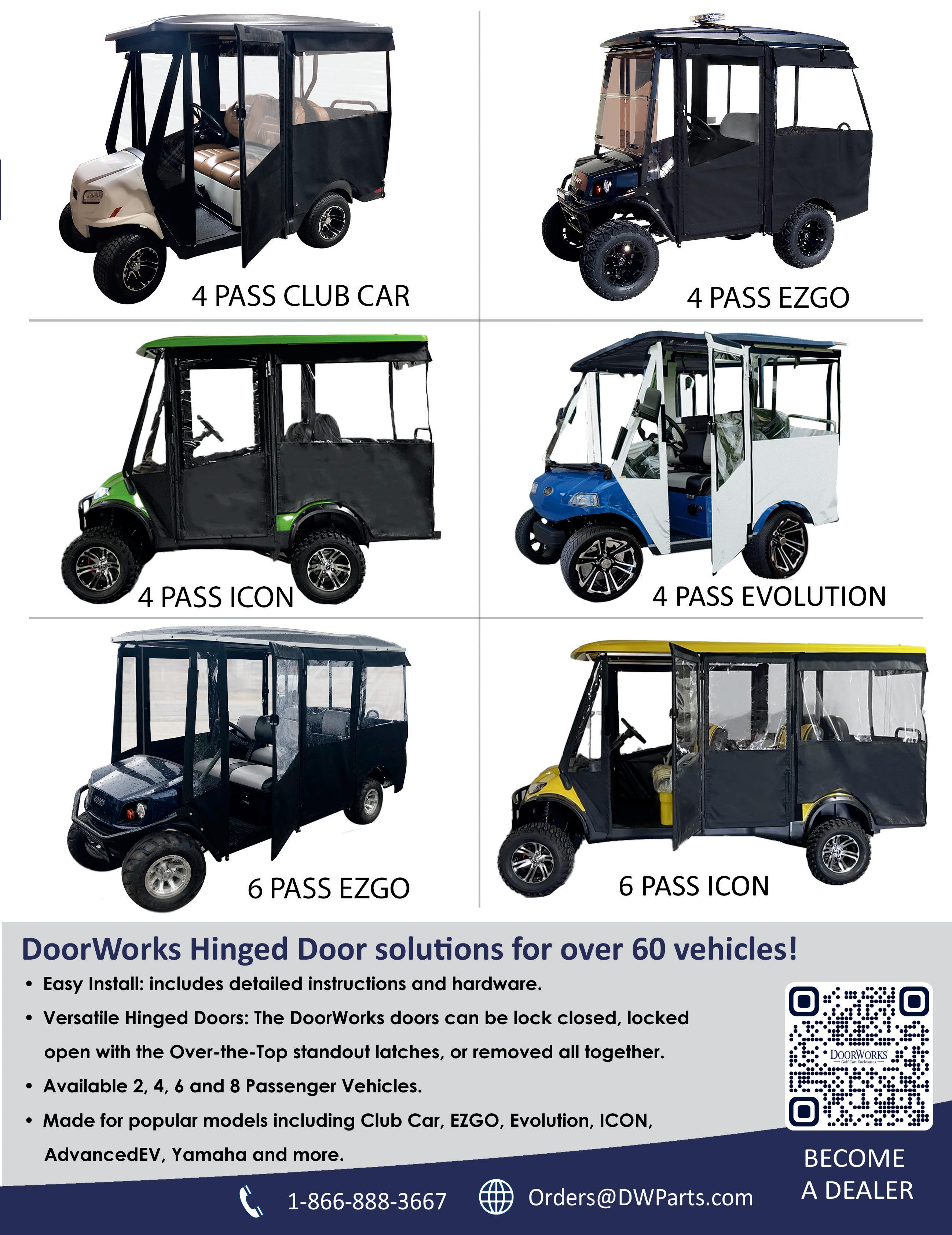 DoorWorks added over 15 new enclosure models this past year, bringing their total to 125+ options across all major brands. From the new E-Z-GO RXV modular roof to Evolution's DMAX and D5 models, DoorWorks continues leading the industry in fitment accuracy and quality. Their hinged door and track-style systems deliver durability dealers and customers can count on.