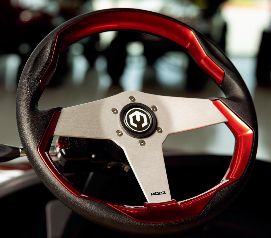 The MODZ Zilker is a 3-spoke Italian-made steering wheel with textured grips for extra comfort and control. It comes in 9 color options with either black or silver spokes, and the kit includes the steering wheel adapter, so you’re ready to swap it in. The anodized aluminum construction is solid with almost no flex, and there’s even an optional scorecard holder if you’re using your cart on the course.