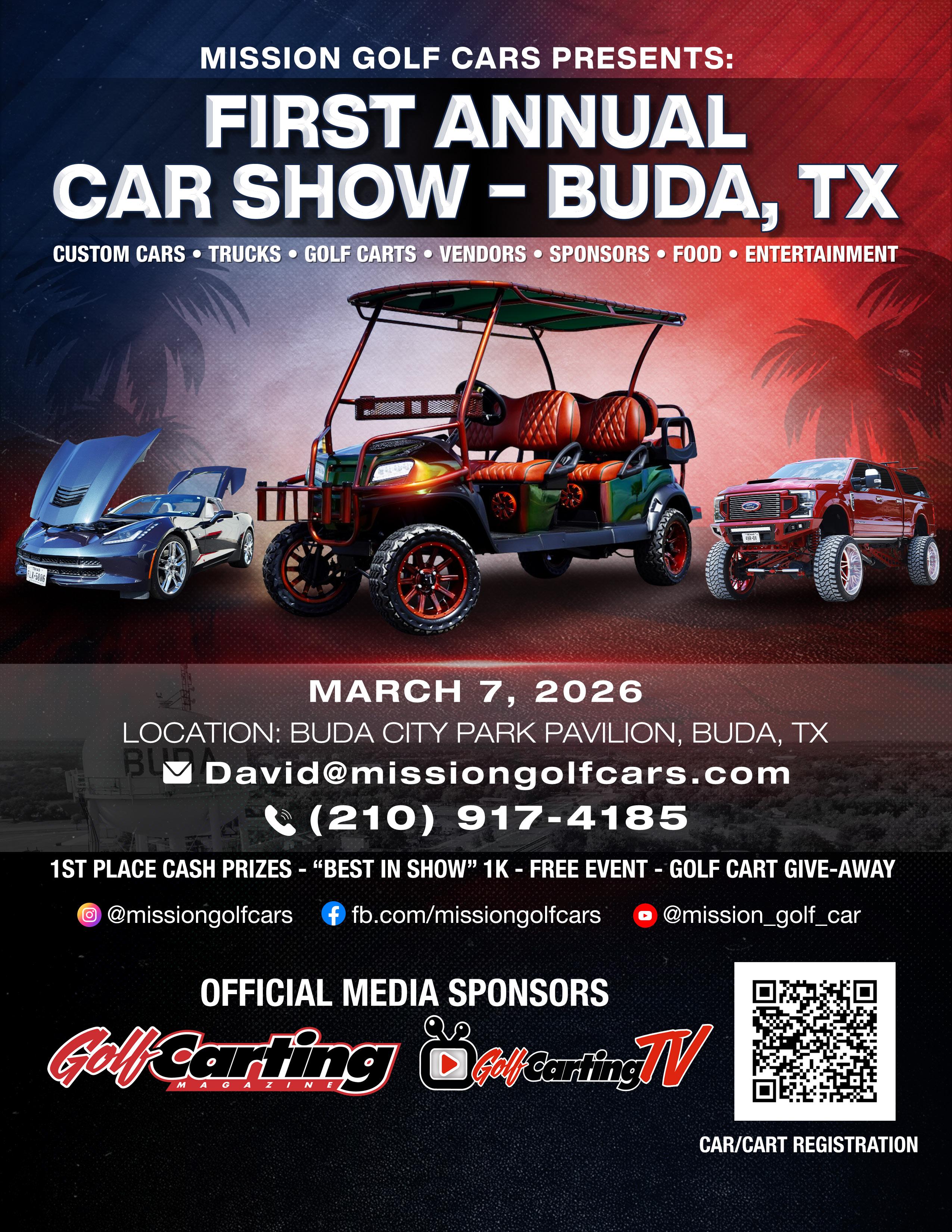 Mark your calendar for March 7th—Mission Golf Cars is launching their inaugural Car & Golf Cart Show at Buda City Park Pavilion. With a $1,000 Best in Show prize, golf cart giveaway, and free admission, this Central Texas event brings automotive and golf cart communities together. We're proud to serve as official media sponsors. As always, thank you for being part of the GolfCarting Magazine family. Whether you're building, upgrading, planning events, or simply enjoying the ride, we appreciate you.