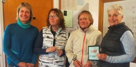 The play-off responsibility fell on the shoulders of the teams No.1’s, Scargill’s Ingrid Cadenhead and Hanmer Spring’s Nicky West to decide the final outcome and it was Ingrid who rolled in a crucial 12 foot putt on the first play-off hole to seal the win for her delighted Scargill team, from left, Janet Murray, Jo Sampson, Ingrid and Jan Moir.