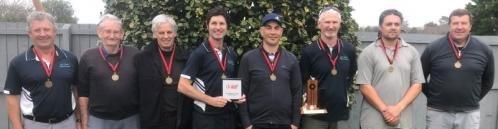 The Ashby Bergh Trophy match was between Tai Tapu (Canterbury Central Patterson Cup Winner) and Pegasus Gold (Canterbury North Templeton Cup Winner) with the Pegasus Gold team of, from left Andy Jones, John Woods, Mike Clapham, Cam Waghorn, Tom Hobson and Royce Ellis defeating Tai Tapu’s Jason Blair, Sean Spencer, Derek Watson, Tony Thorpe, Frank Tabley and Jeff Cairns in a tight match 3.5-2.5, with three matches being decided on the final two holes.