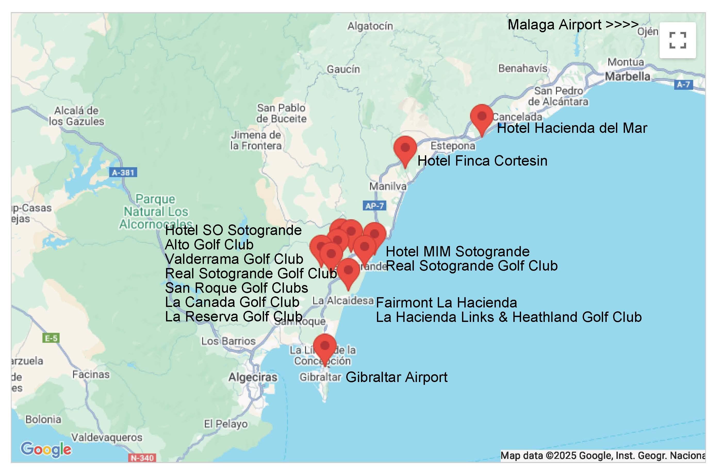One round each at Finca Cortesin (including buggy), Alto, La Reserva, Hacienda Links, San Roque Old