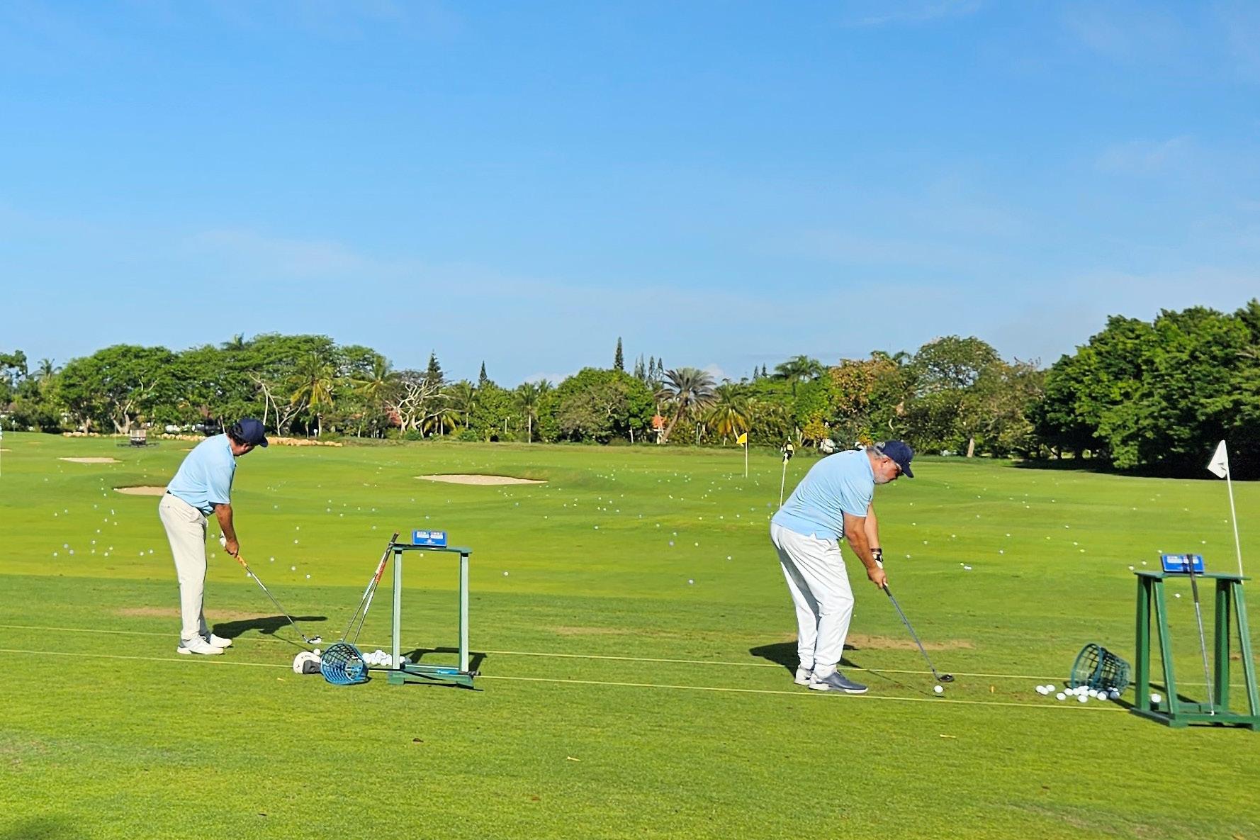 Jugadores en el campo de práctica, preparándose para el torneo