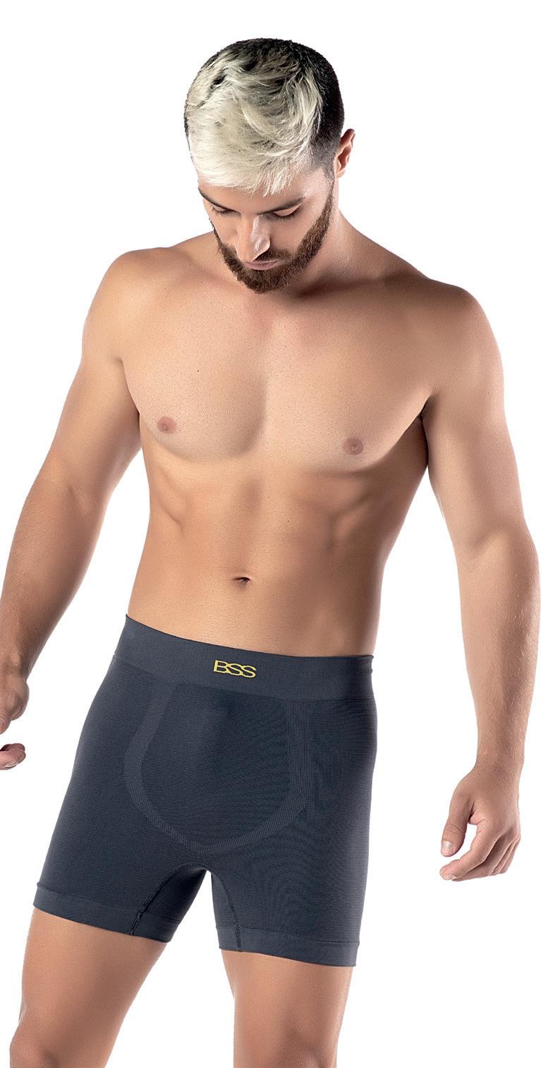 Cueca boxer em microfibra. Sem costura, com cós bordado e perna alongada.