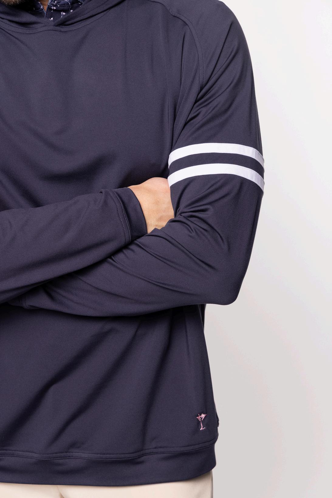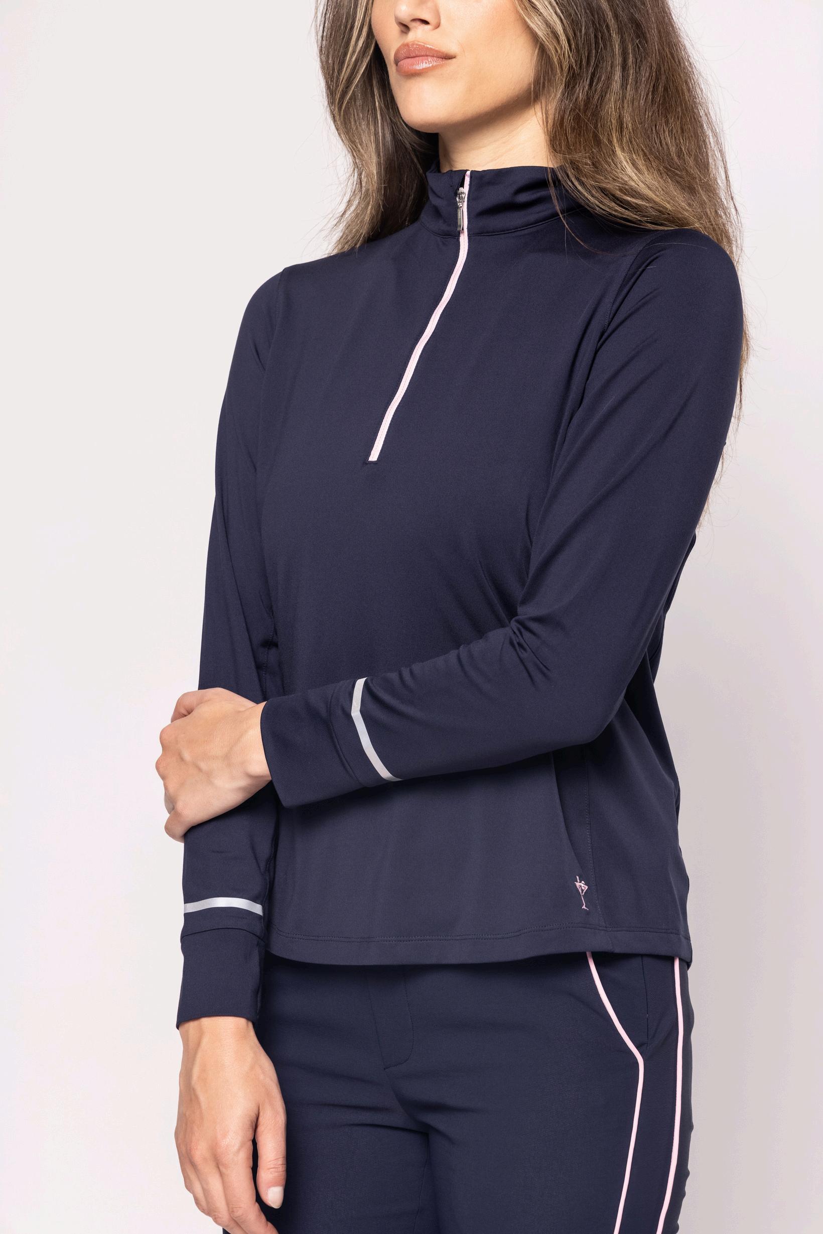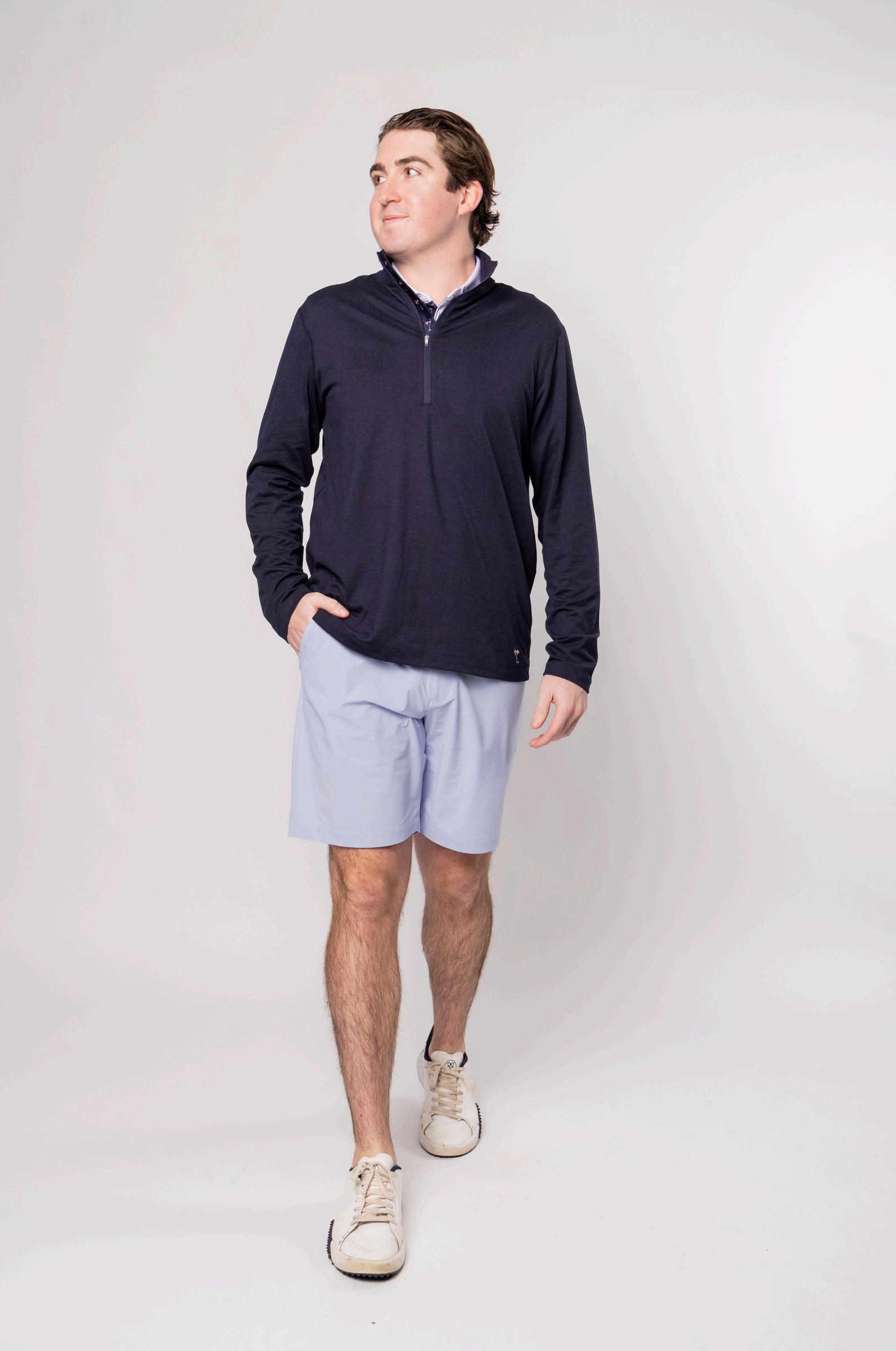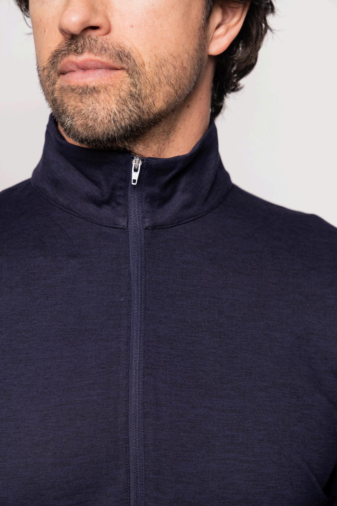 $65 | performance fabric 88% polyester, 12% spandex navy martini placket s-xxl HEATHERED HALF ZIP