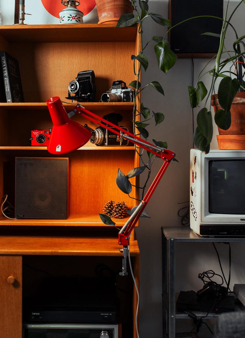 Tillsammans med dagens fynd bjuder Joel med oss hem och vi får chansen att höra mer om hans passion för second hand. I en etta på 39 kvadrat, som är smakfullt och personligt inredd med handplockade detaljer, krävs ingen större ansträngning för att snabbt räkna in tre cyklar, fyra gitarrer och tjugosju kameror. Det sistnämnda känns knappast som en överraskning hos en loppistokig fotograf.