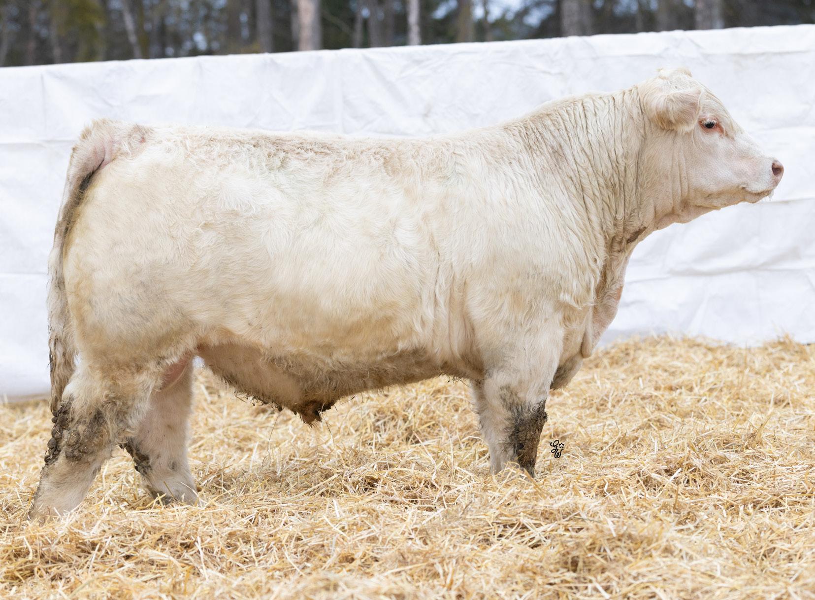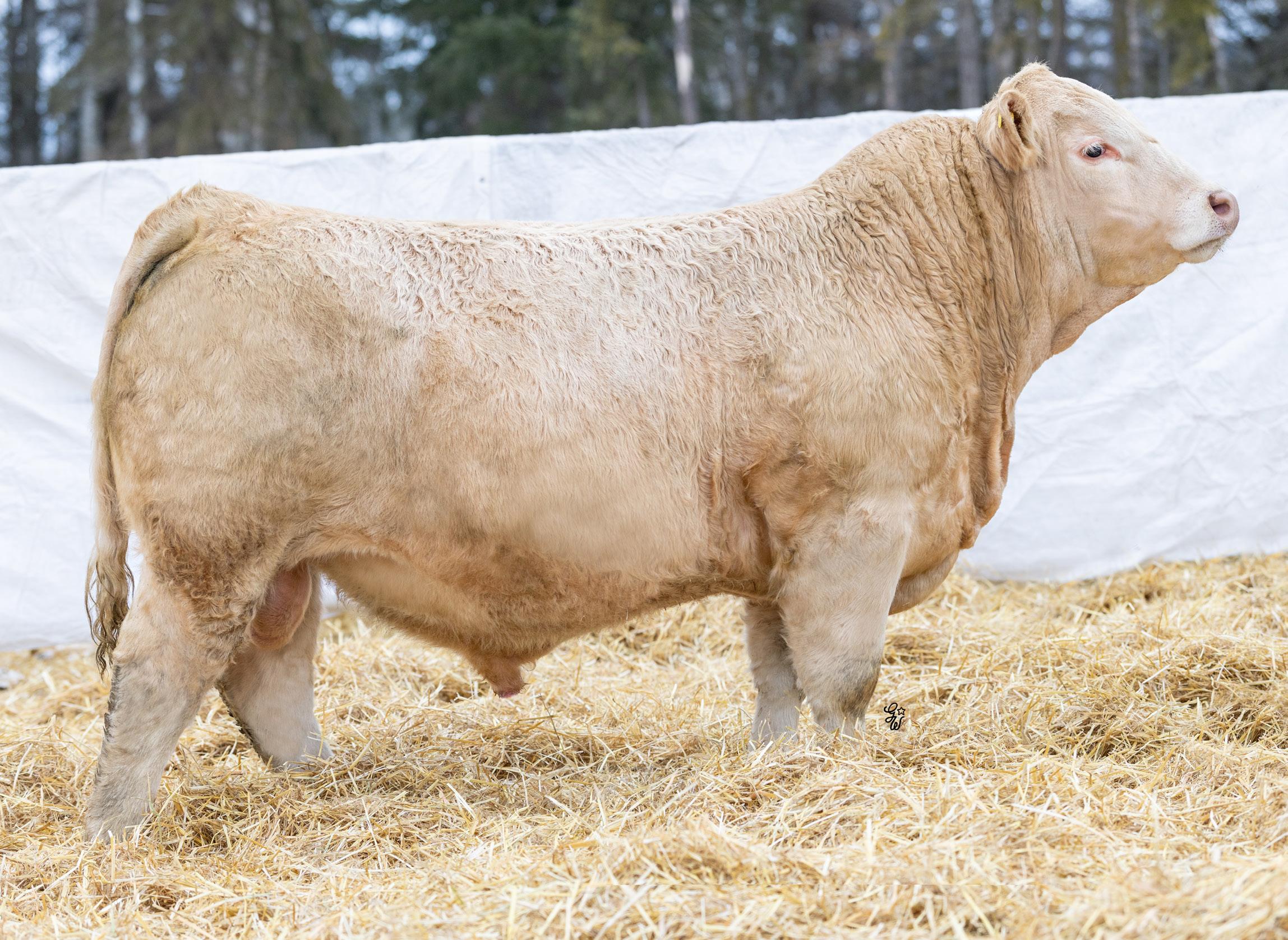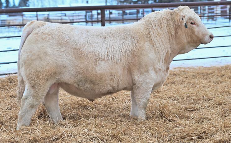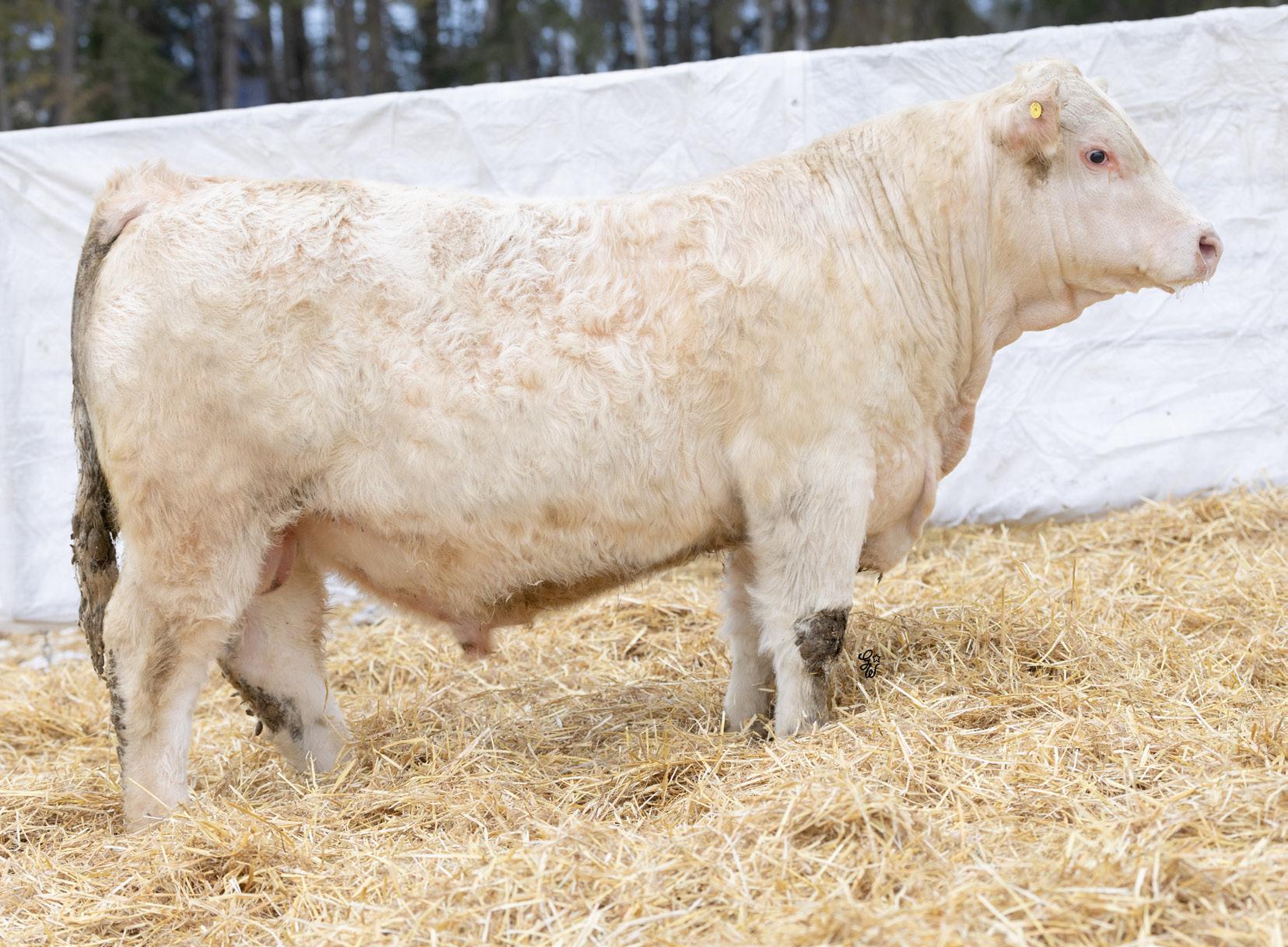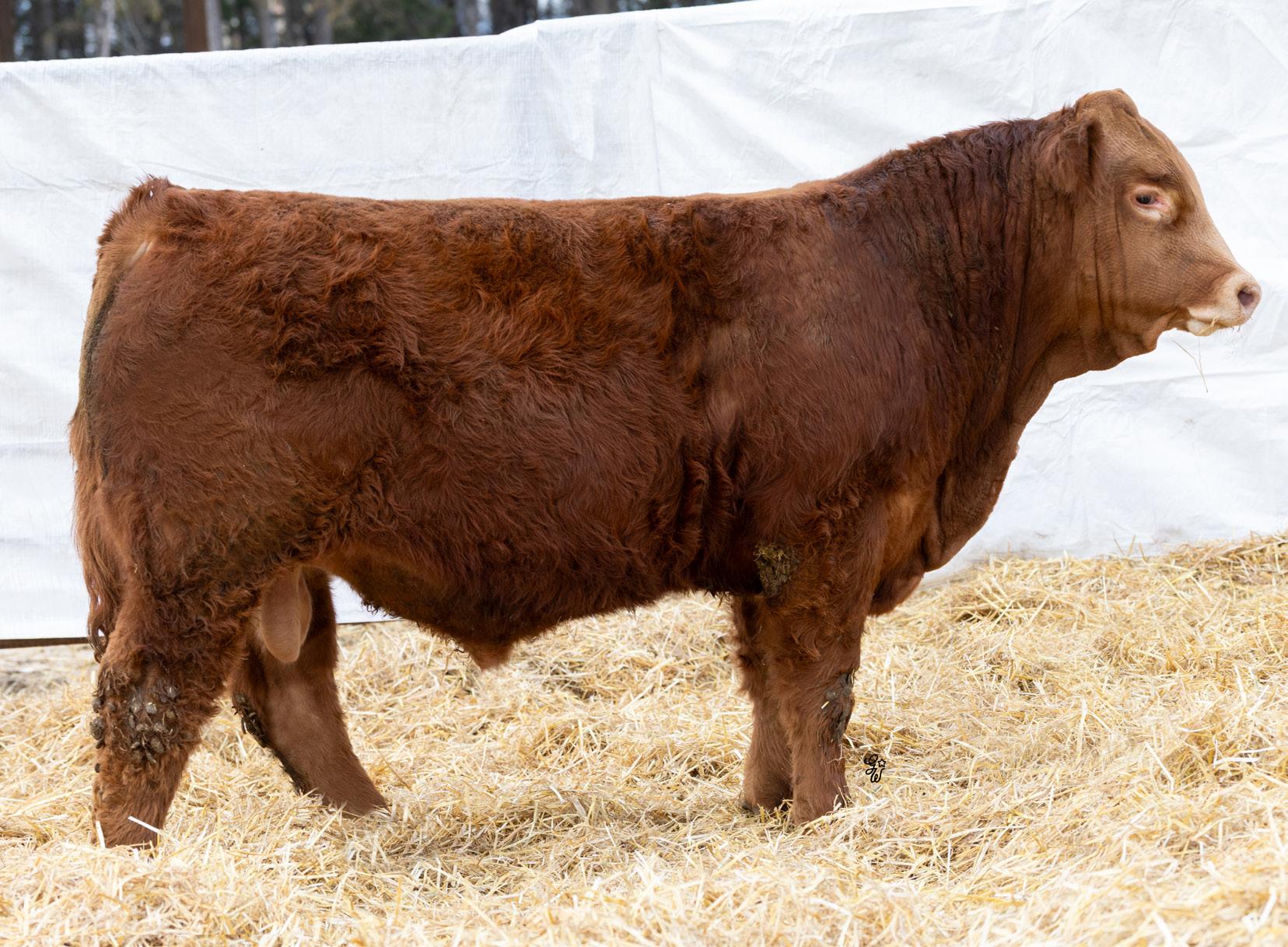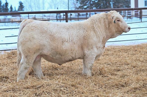 Another pen favorite here. I have loved this guy since he was little and he’s impressed me at every stage. His dam is beautiful, heavy milking cow that came to us from the New Life Limousin program in Ontario and has impressed us year after year. She had a two year old son in the sale last year who is now working for Walter and Lisa Elisa in Vanderhoof, BC. This long bodied, deep chested, big footed bull has a herdbull presence to him and will command your presence on sale day.