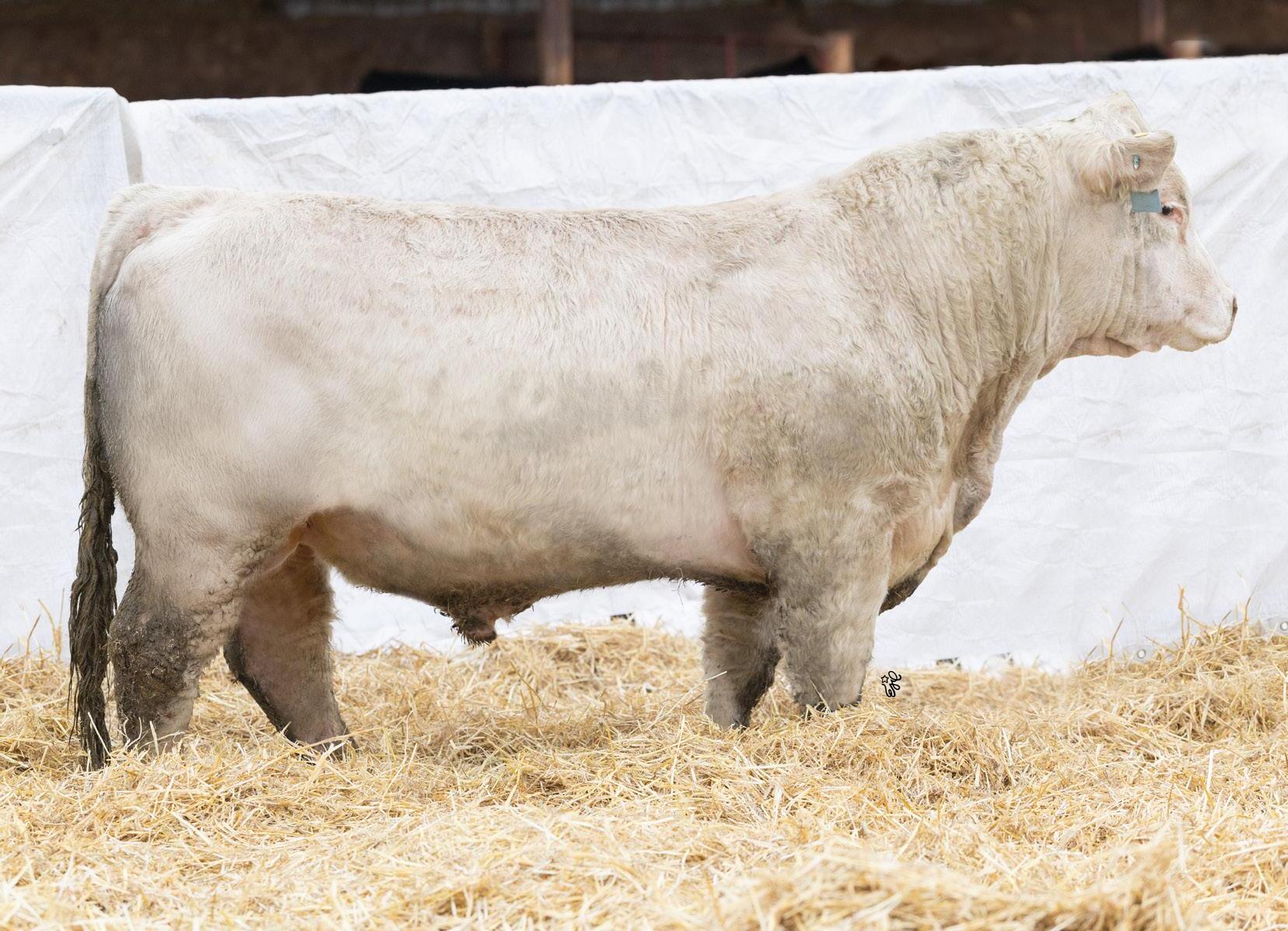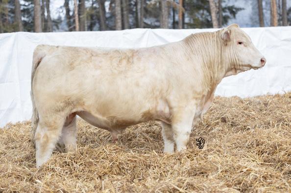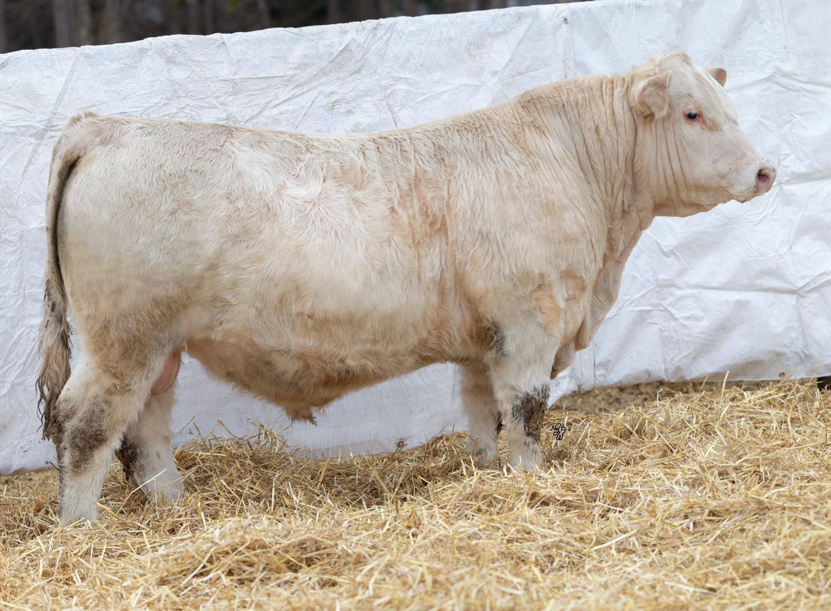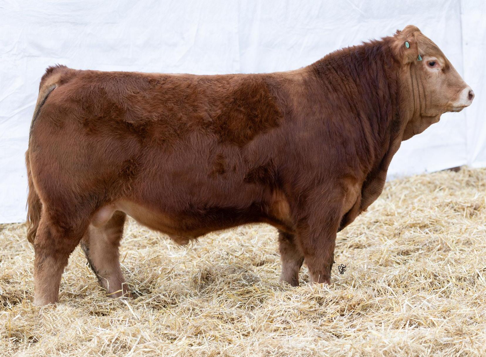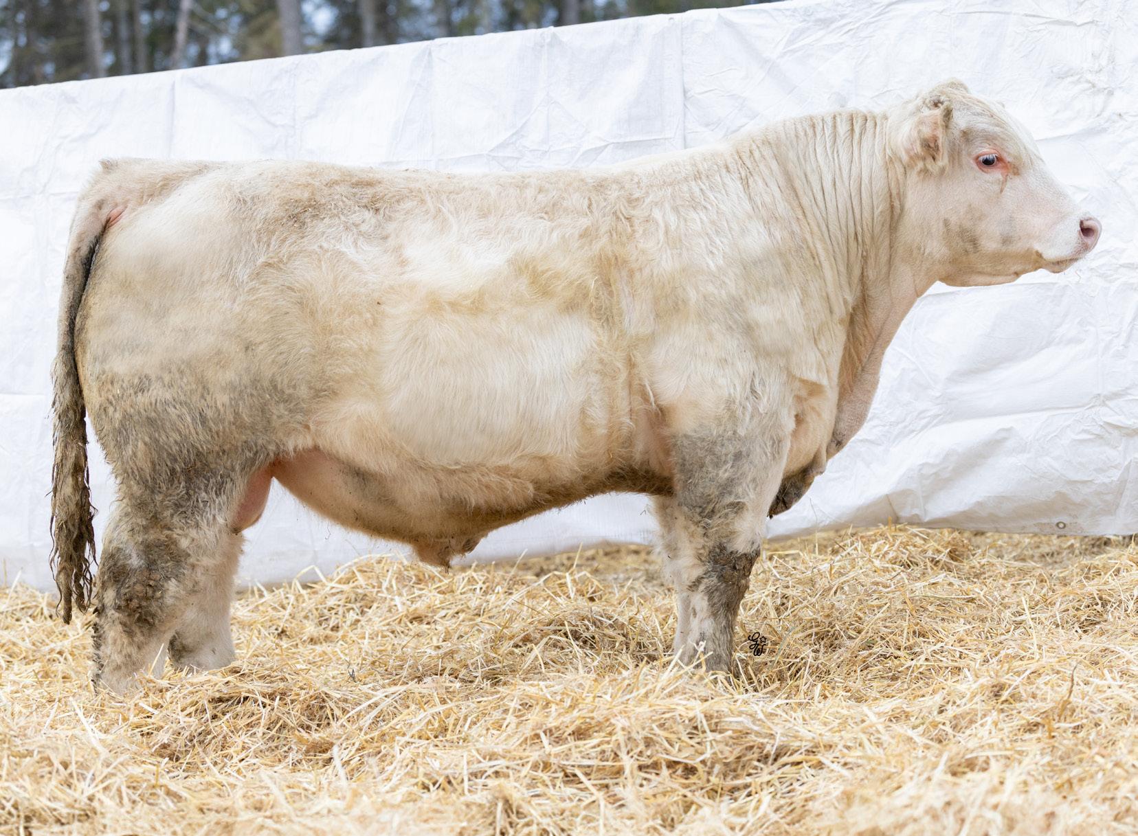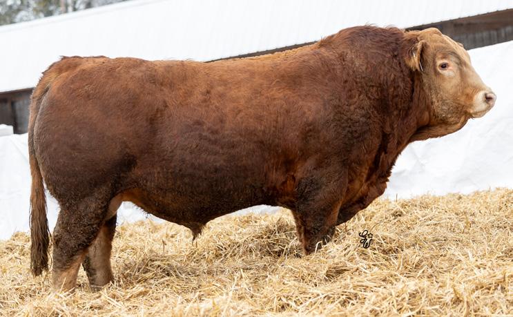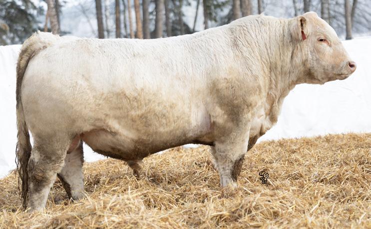 Another pen favorite here. I have loved this guy since he was little and he’s impressed me at every stage. His dam is beautiful, heavy milking cow that came to us from the New Life Limousin program in Ontario and has impressed us year after year. She had a two year old son in the sale last year who is now working for Walter and Lisa Elisa in Vanderhoof, BC. This long bodied, deep chested, big footed bull has a herdbull presence to him and will command your presence on sale day.