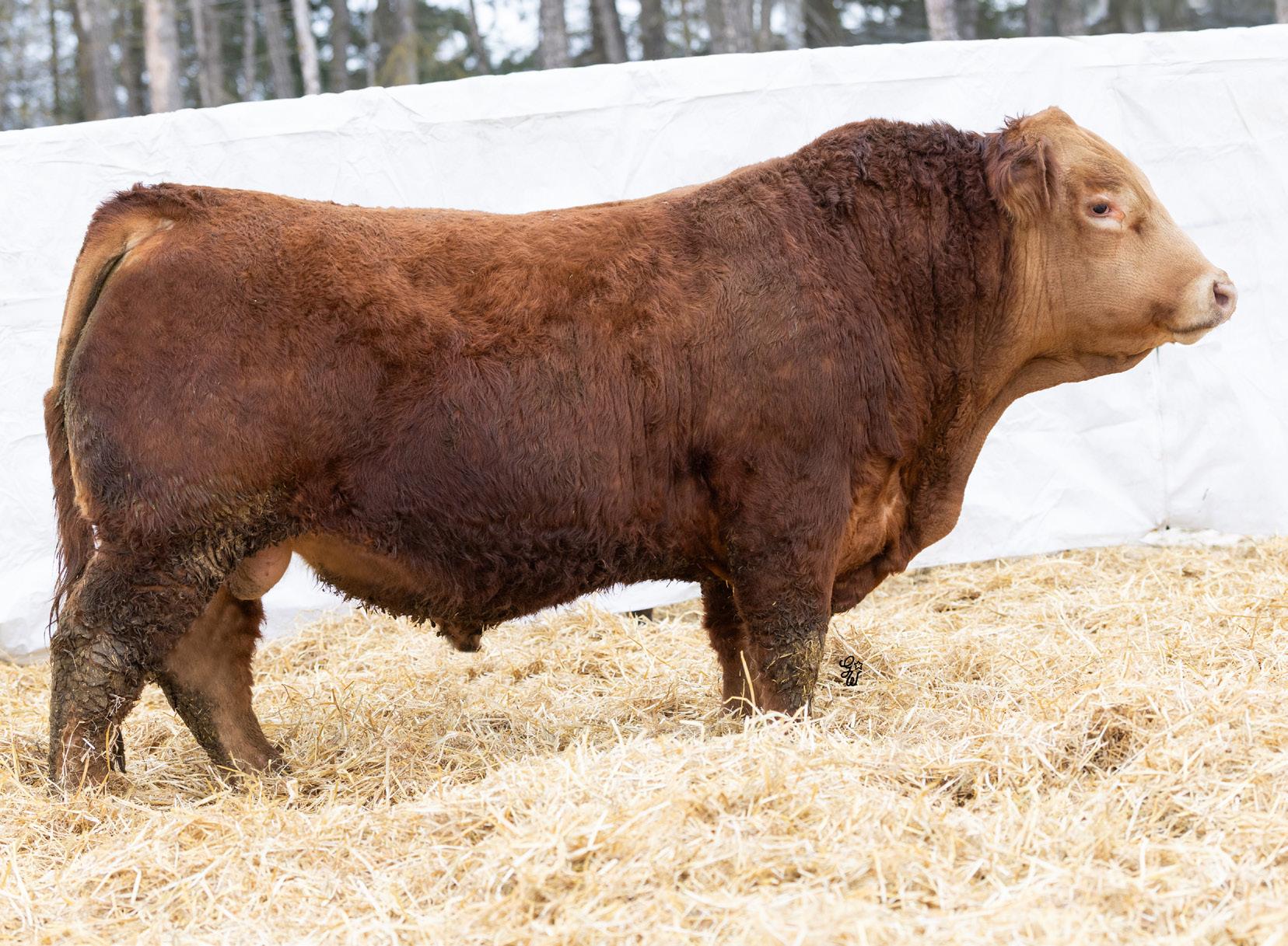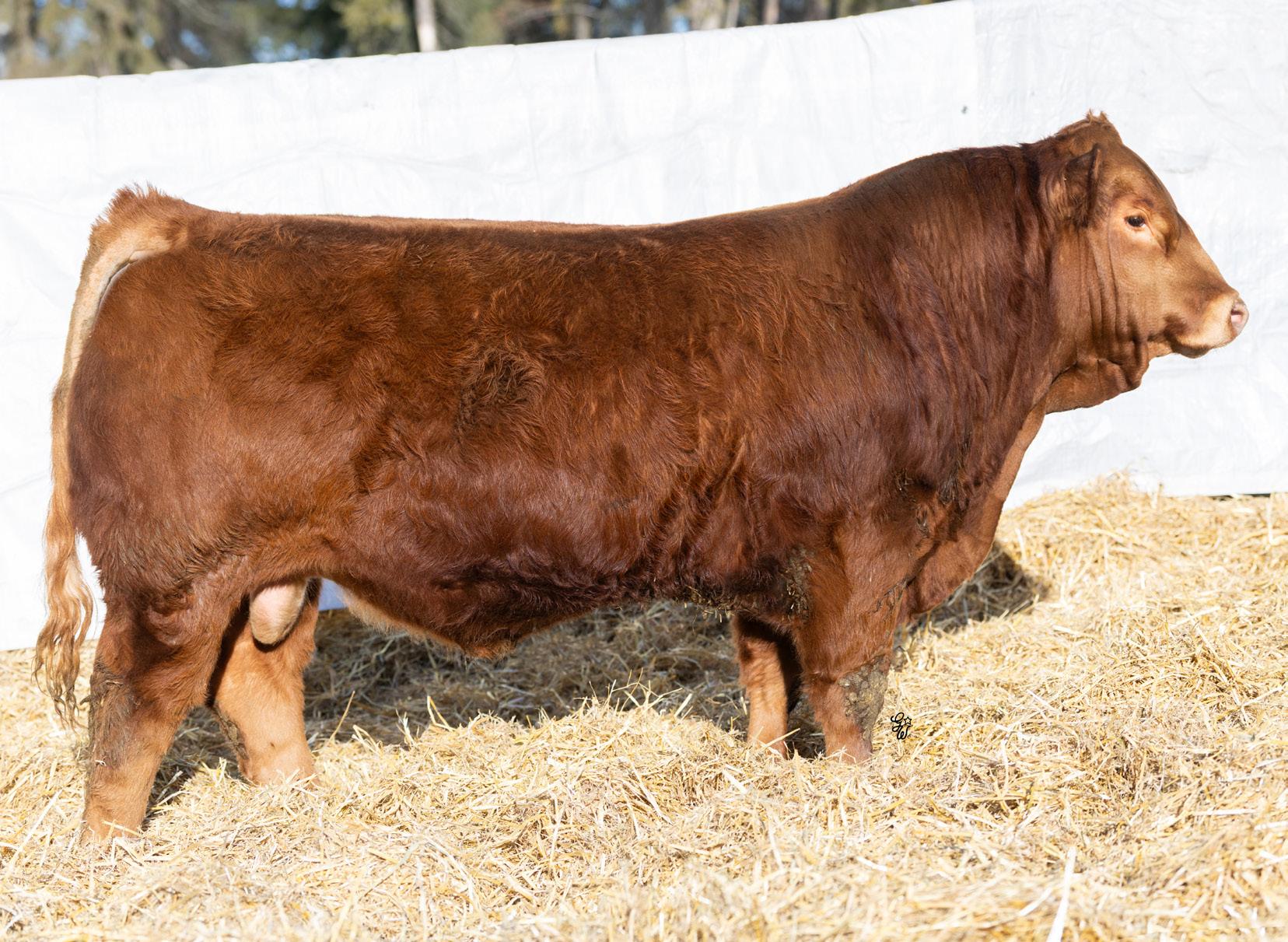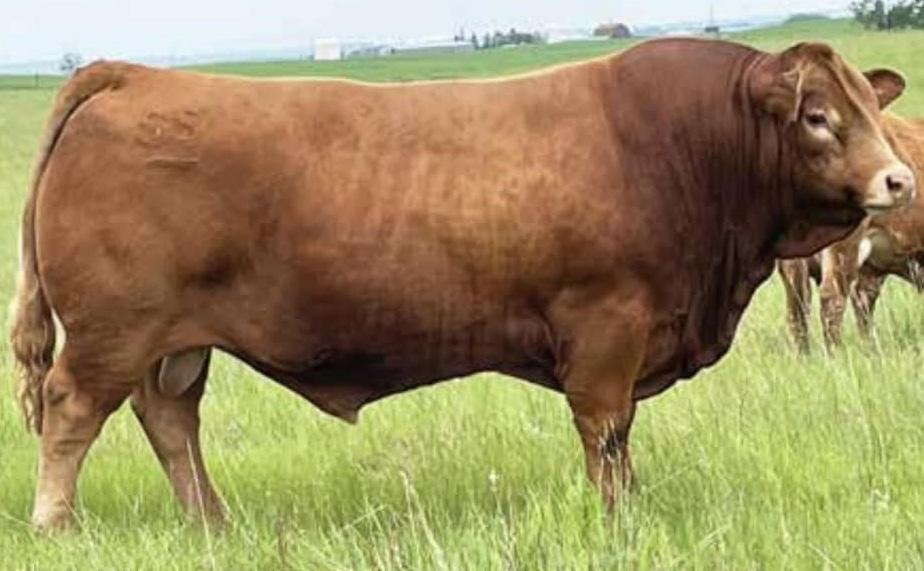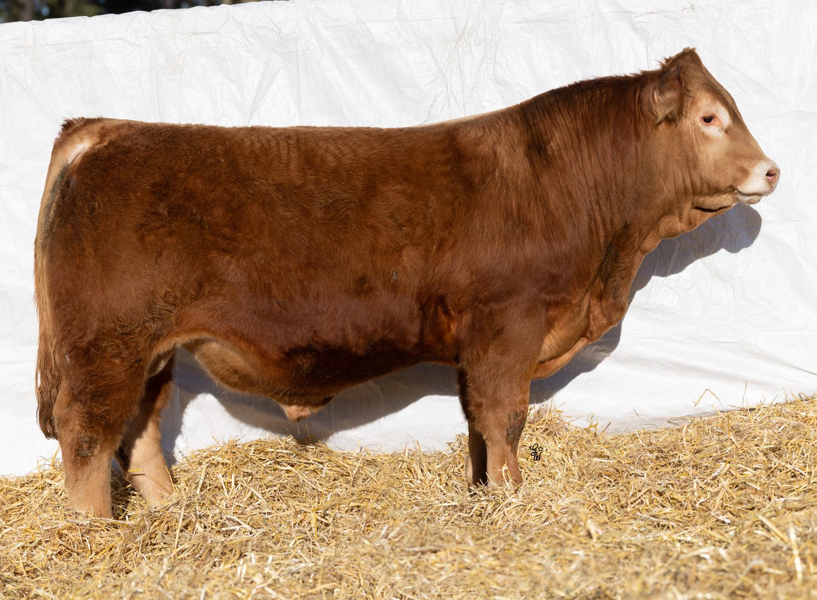 Huge hipped bull here with tons of muscle and dimension. This Hector son is unique individual with a ton of style and eye appeal. He has a bit of scur on his skull, but don’t be worried, I assure you it is not horns. This bull is backed by an impressive set of grow and carcass numbers, some in the top 3% of the breed. He has a maternal brother working for Marvin Monical and a maternal sister working for Tyler Skeels of Rimbey, AB.