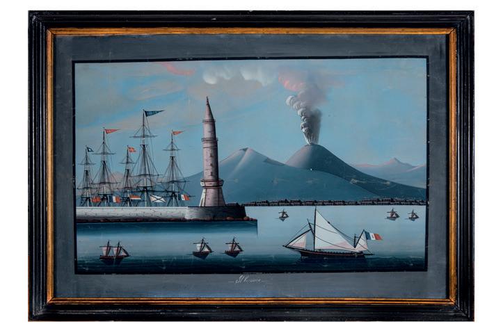 con la lava che fuoriesce presso la Certosa e Museo Nazionale di San Martino (inv. 23457) con in basso sul montaggio l’iscrizione “Eruzione del 1868”. Le due vedute sono prese dal mare con numerosi velieri, a sinistra il molo e il faro, in due diversi momenti del giorno, con la luce e al calar della sera. (2)