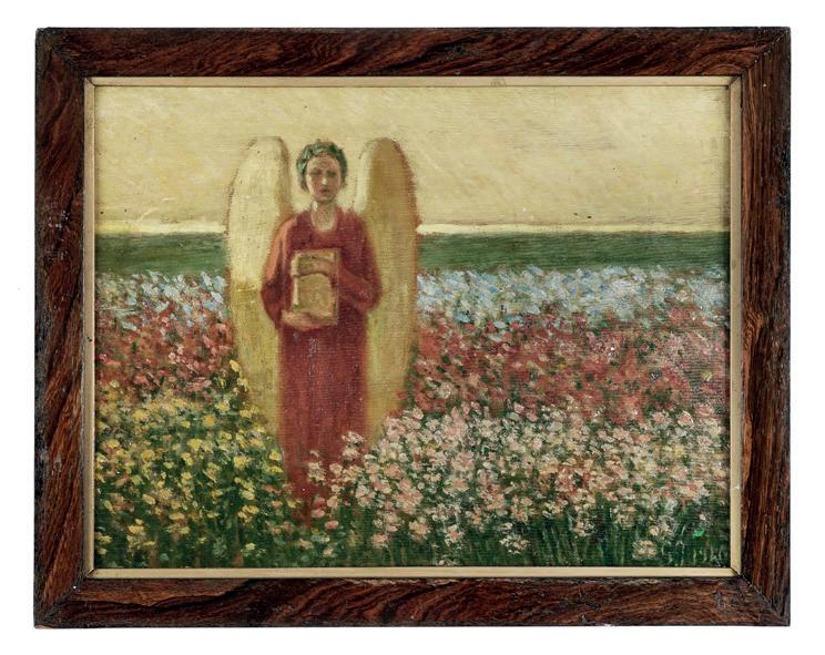 Olio su tela applicata a tavola. cm 46,5x23. Firma poco leggibile in basso a destra. Iscritto “T. Oguiss” a matita al verso.