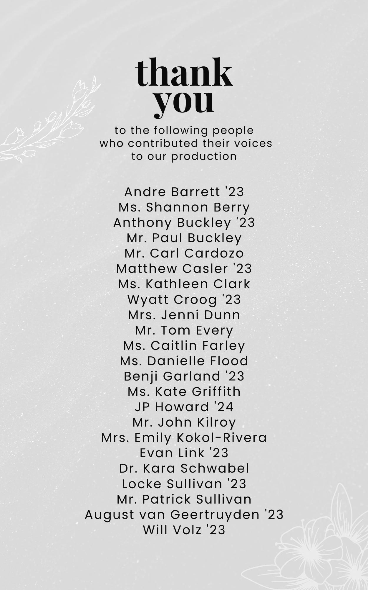 One..........................................................................Matthew Shumaker ‘23 Station Guard/ATM..........................................................................................Johan Torres ‘26 Duty Sergeant.....................................................................................................Milton Yates ‘26 Christopher...........................................................................................................Caleb Linn ‘24 Ed.......................................................................................................................Luke Cousins ‘25 Siobhan................................................................................................Ella Schmigdall ‘25 (WL) Judy.........................................................................................................Brigid Limarzi ‘23 (GV)