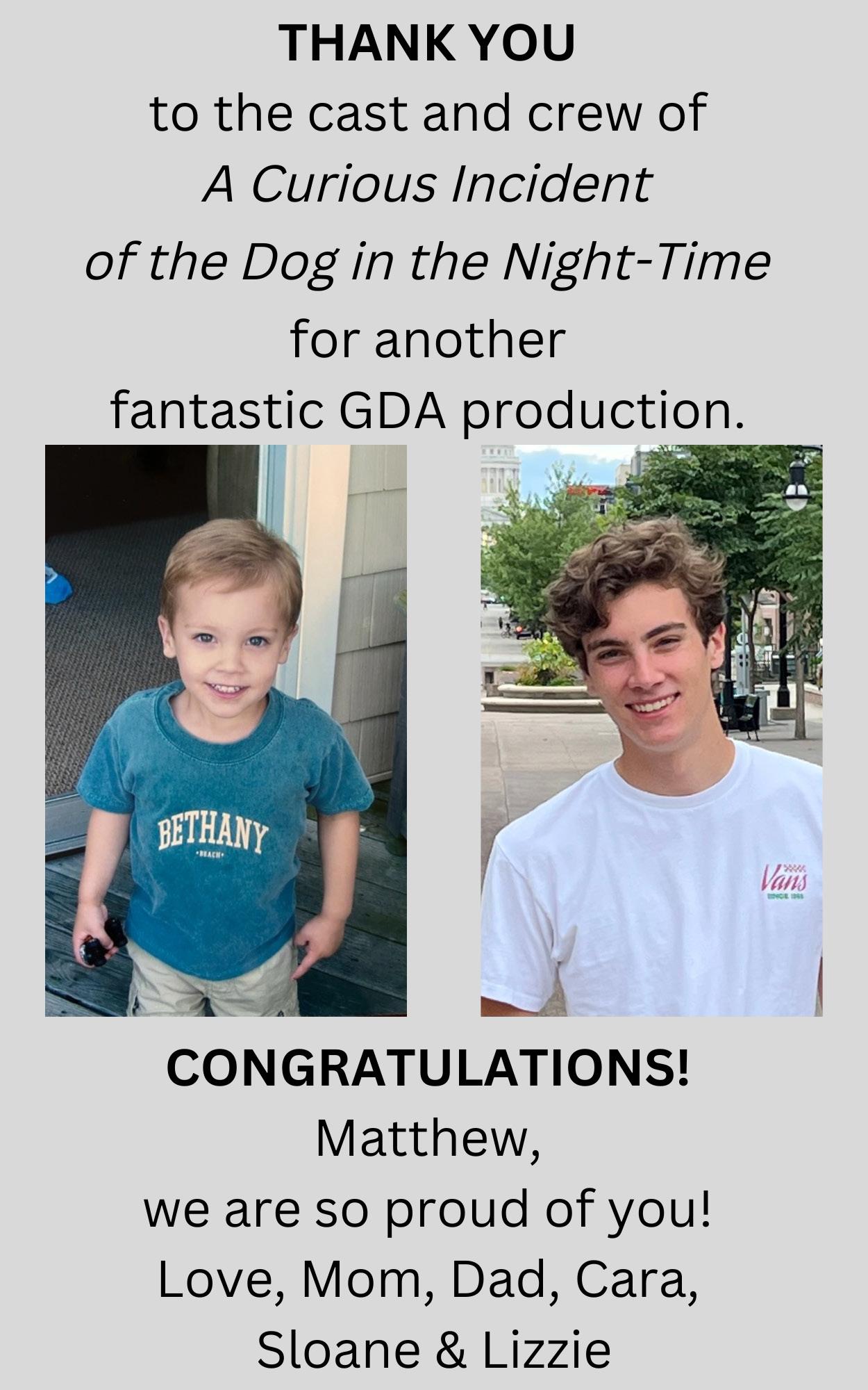 It has been incredibly special to create this show on our stage over the past eight weeks. The Cast and Crew have worked incredibly hard to bring this story to life with authenticity and creativity. This is not an easy story to tell, but they have gone above and beyond to bring it beautifully to life. I would like to thank the Gonzaga English Department for working with us to align the production of this play with the Sophomore curriculum, especially Ms. Kathleen Clark who served as our Dramaturg and helped the actors understand the intricacies of Christopher’s story. I am also incredibly thankful to my team of adults: Mr. Paul Buckley, Mrs. Meghan Goldsmith, and Mrs. Kimberly Notarianni for their hard work behind the scenes; Ms. Sophia Menconi, Mr. Andrew Bevilacqua, and Mr. Dean Leong for their technical expertise in creating Christopher’s world on stage; and especially my Co-Director, Mr. Andrew Curtin, who has been integral to the creation and success of this production.
