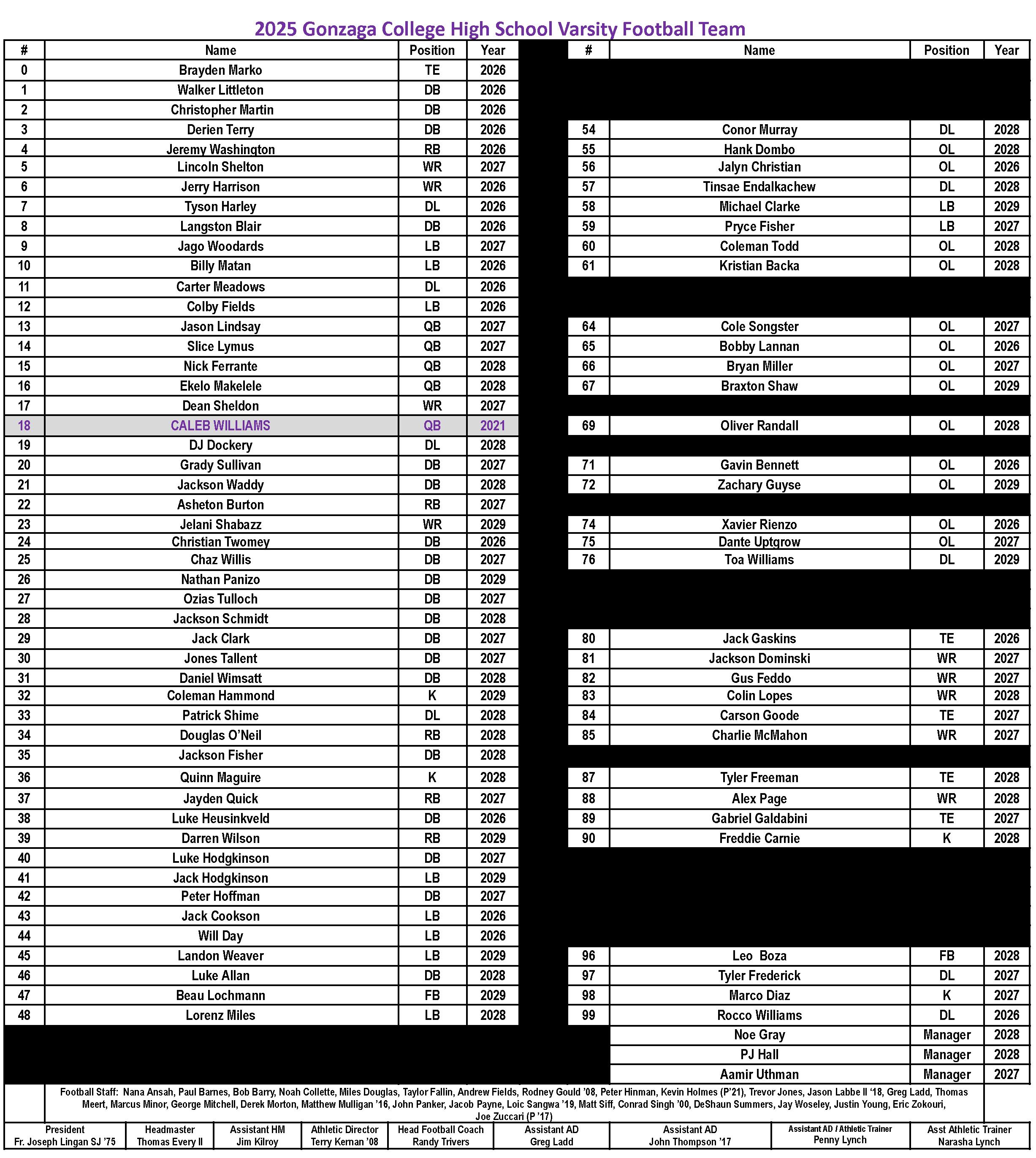 On behalf of our Headmaster, Mr. Tom Every, our Athletic Director Mr. Terry Kernan ’08, and everyone on Eye Street, I express to all of those participating in Gonzaga’s football program this year my best wish for a successful season! Please know your hard work and dedication are both respected and appreciated.