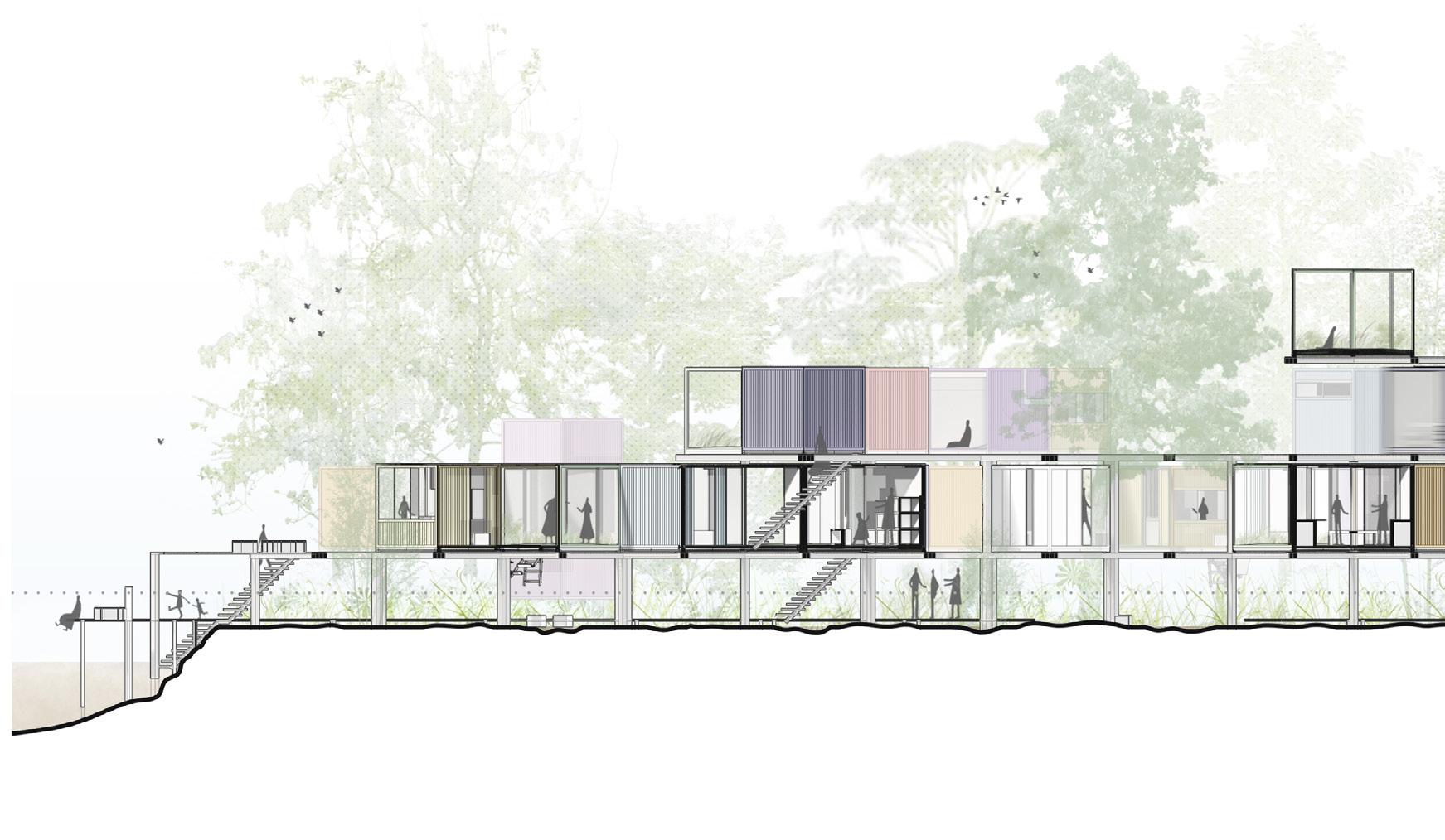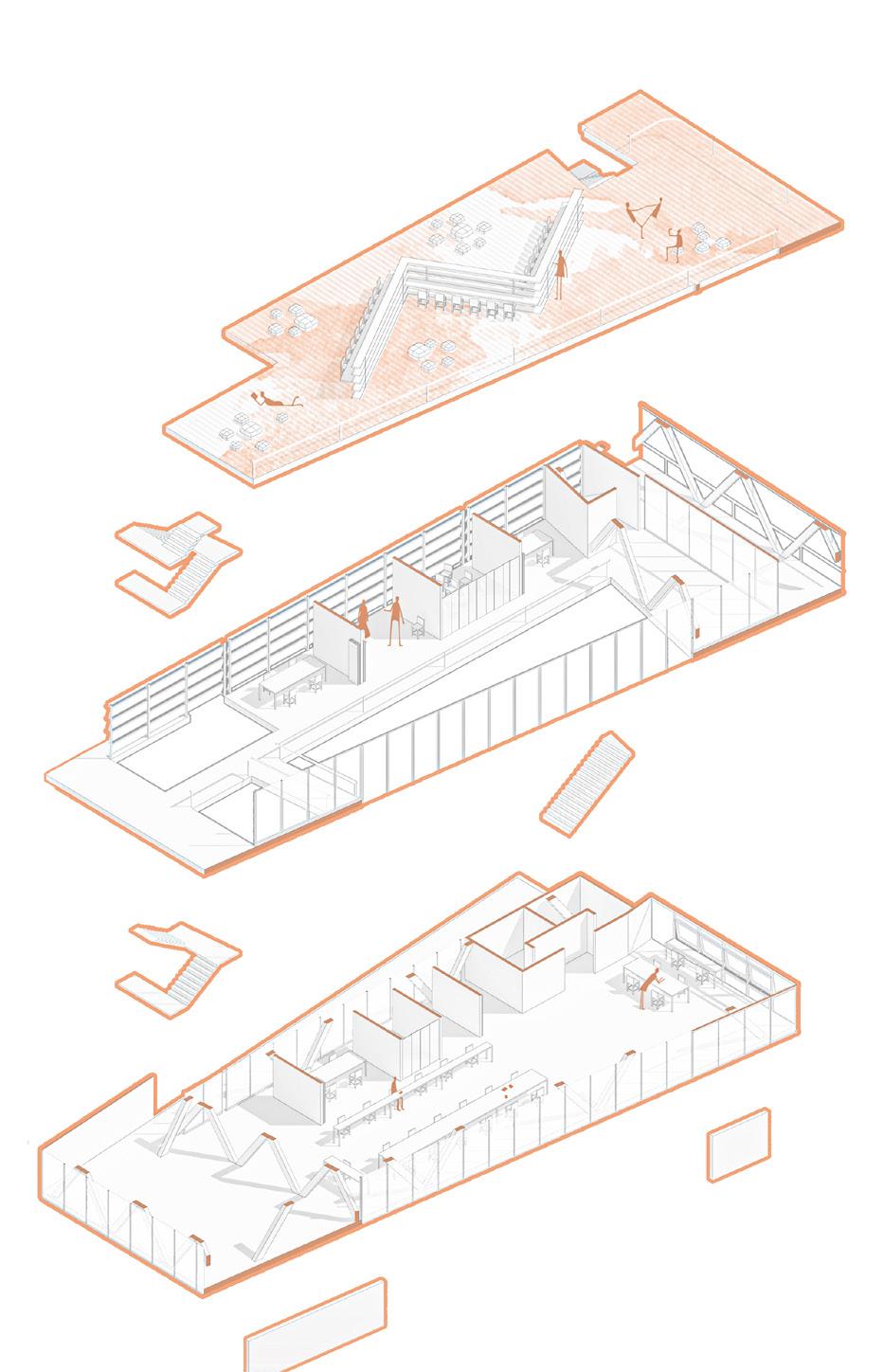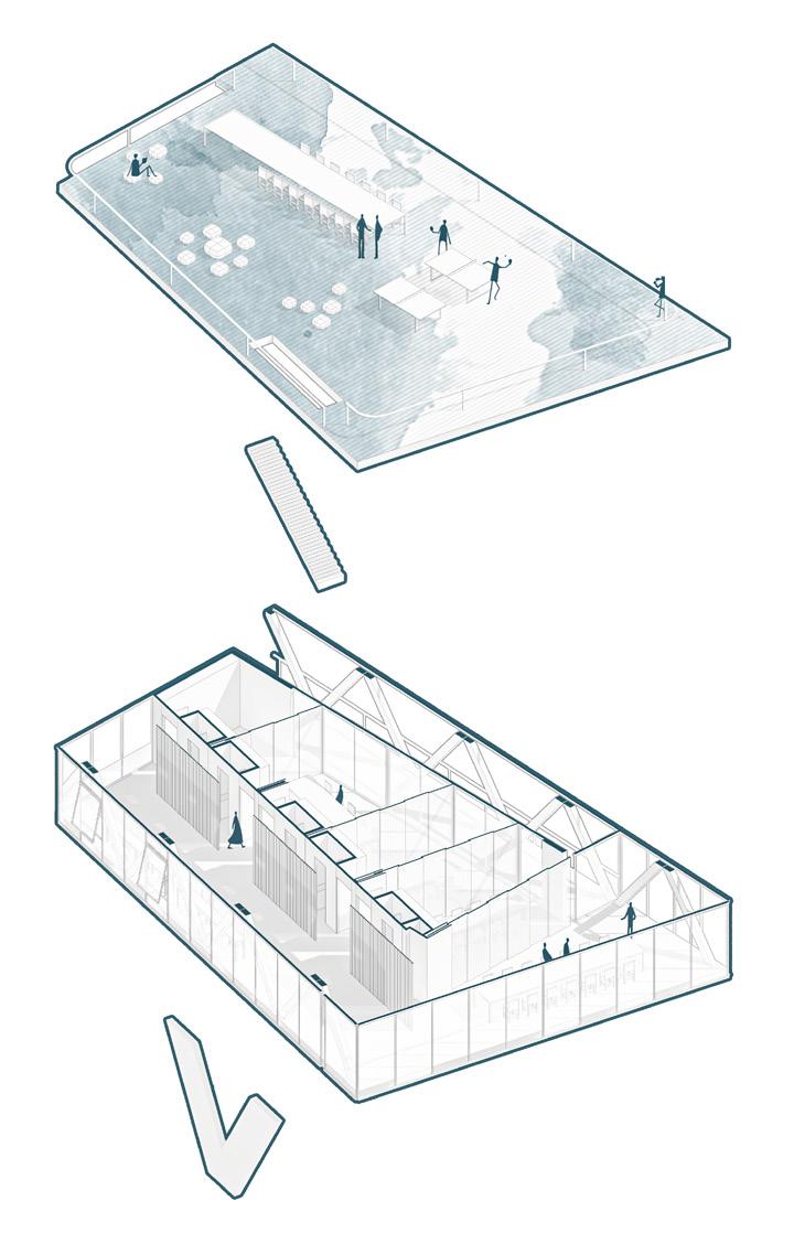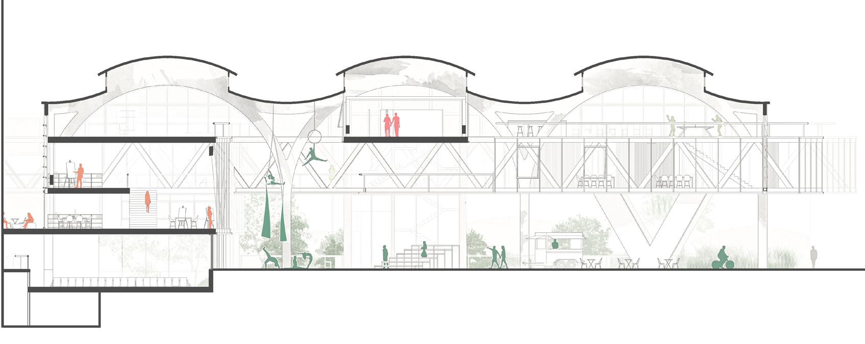 2F 1F workshop collective private recreational TCE 2F coworking private recreational 1 support structure reinforced concrete partition walls 2 main structure slabs + metal beams (Warren truss) 4 flexible spaces movable paneling 5 services cores 6 shaded terraces relaxed program 3 enclosure system glass panels + ventilation openings