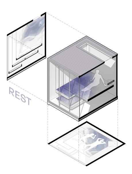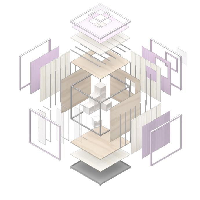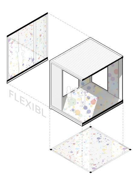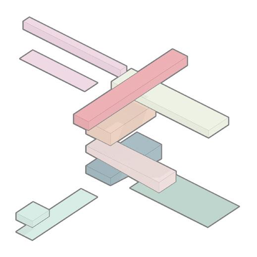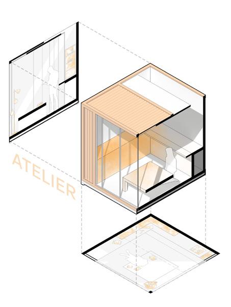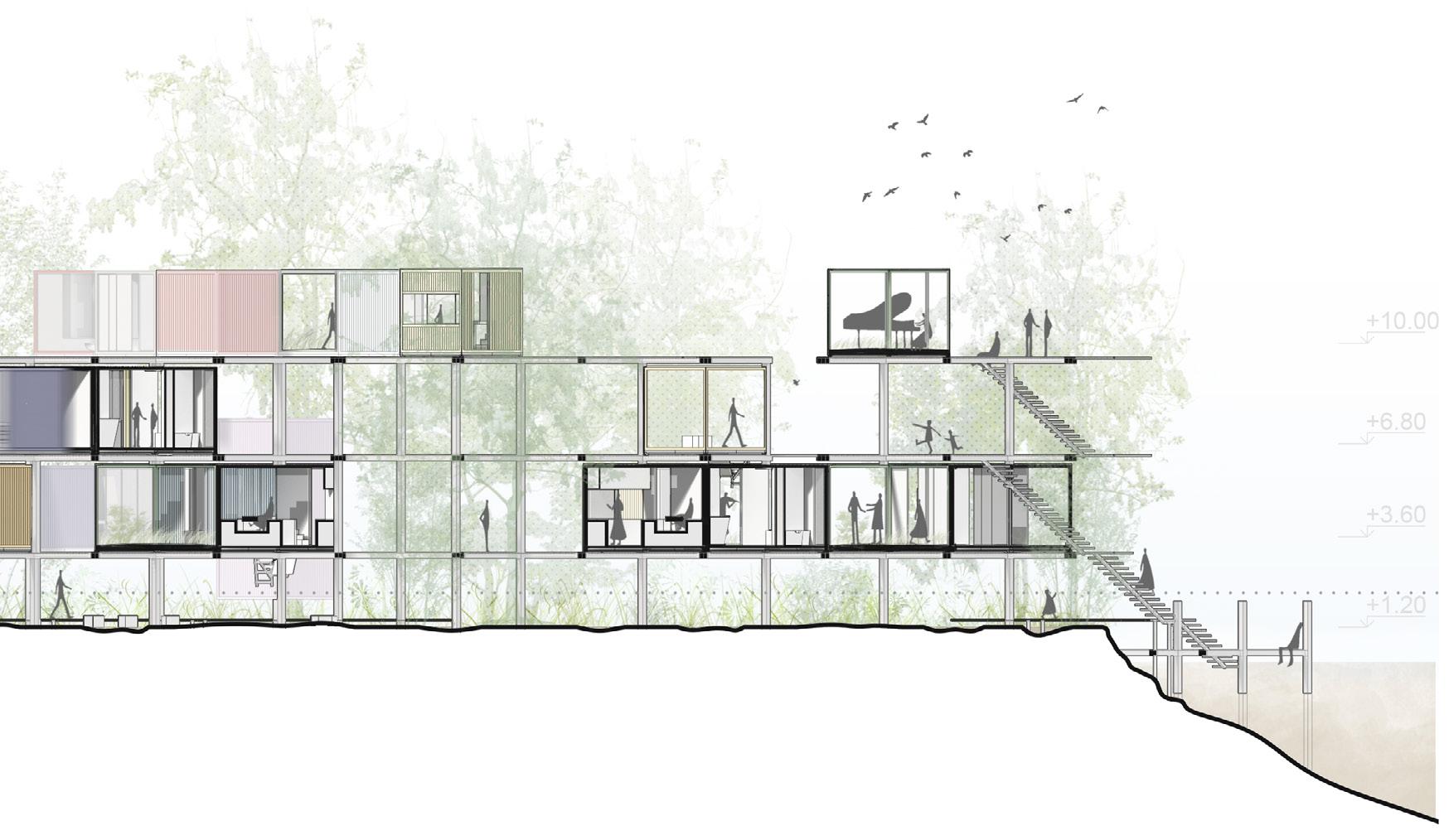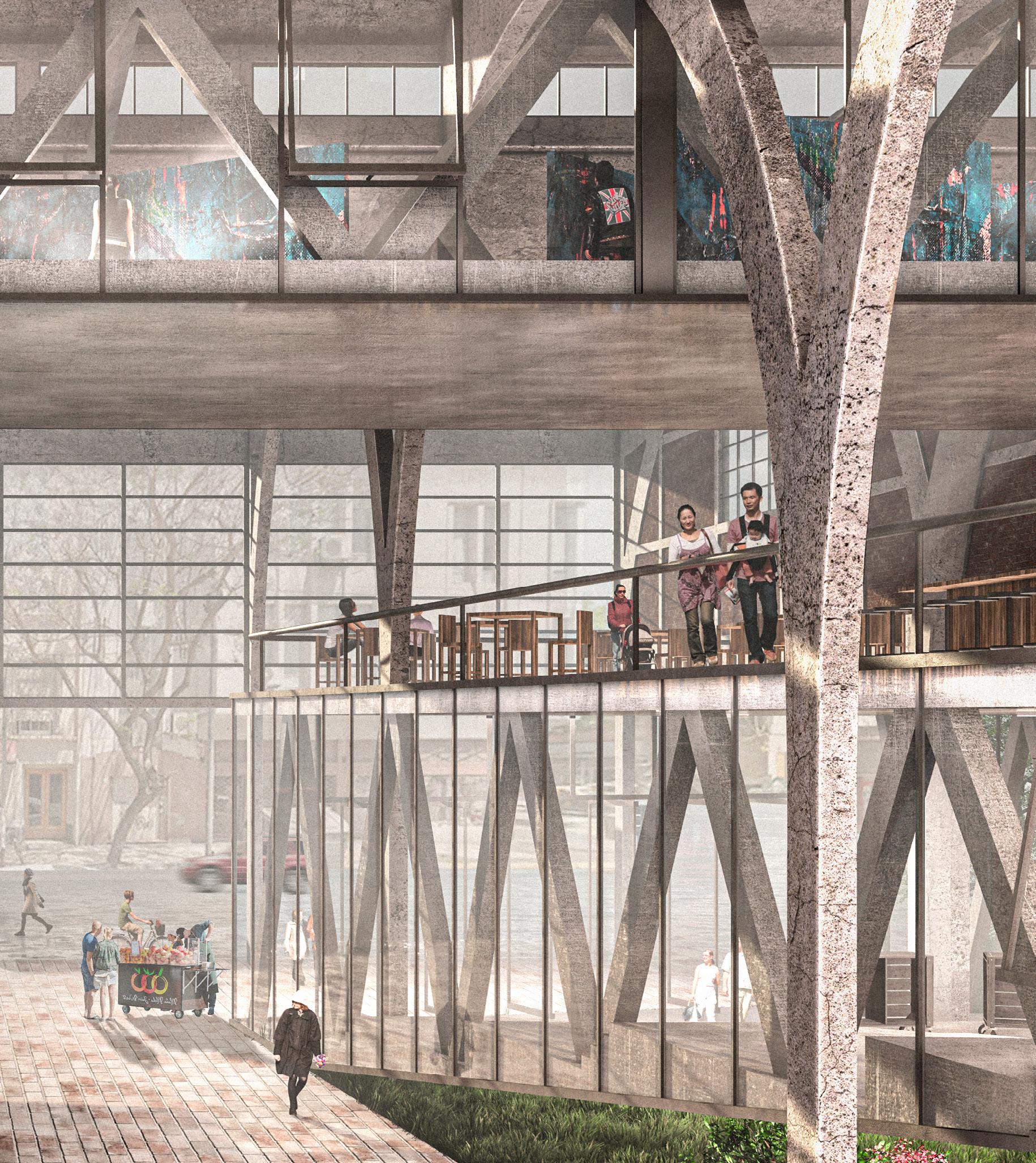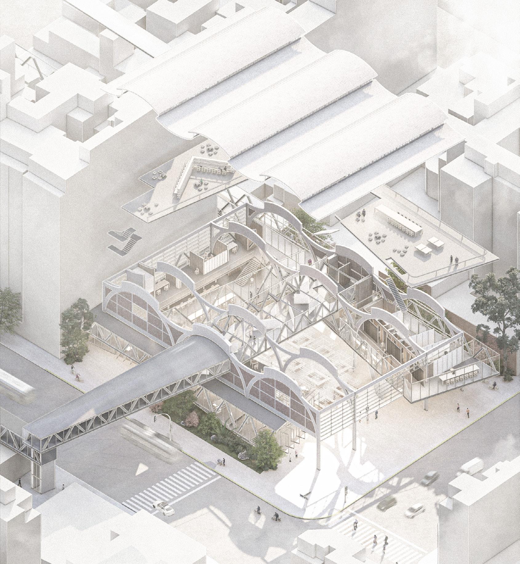 2F 1F workshop collective private recreational TCE 2F coworking private recreational 1 support structure reinforced concrete partition walls 2 main structure slabs + metal beams (Warren truss) 4 flexible spaces movable paneling 5 services cores 6 shaded terraces relaxed program 3 enclosure system glass panels + ventilation openings