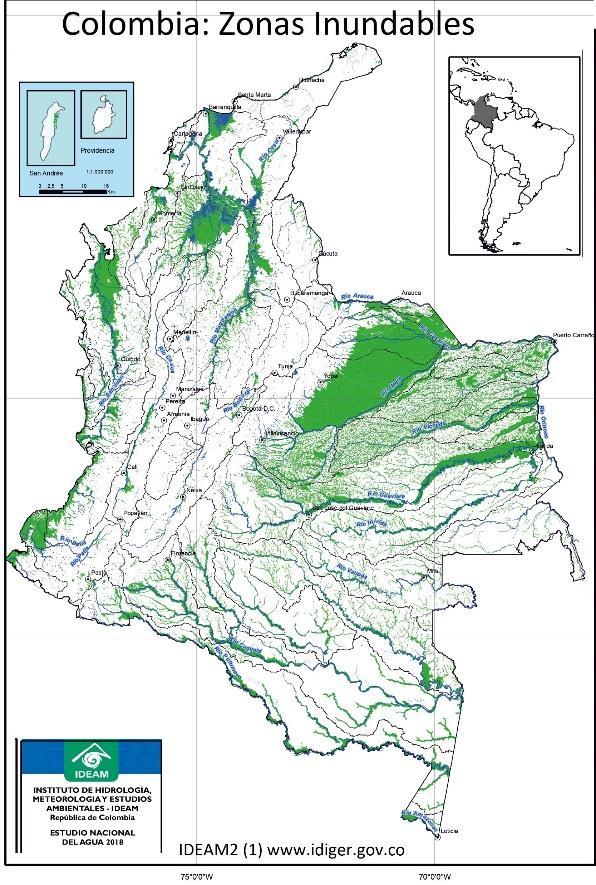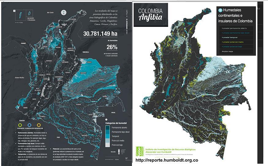 Según Colombia Anfibia los humedales con una extensión de 30,78 M de hectáreas, cubren el 26% del territorio continental. IAvH.