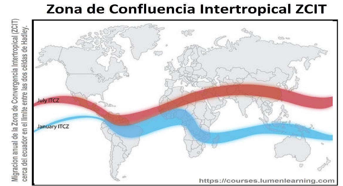 Entonces, nuestra Región Andina, con su clima tropical, presenta cada año dos temporadas secas y dos húmedas que se alternan durante el año, regidas por las posiciones relativas de la Zona de Confluencia Intertropical ZCIT, ese ecuador meteorológico oscílate donde convergen los vientos alisios provenientes de los 60° de latitud Norte y Sur, trayendo humedad y con ella las lluvias. Dado que las masas de aire se desplazan de zonas de alta presión a las de menor presión, y que donde el mar está más frío después de un otoño y un invierno, también el aire lo estará, la ZCIT se desplazará hacia las zonas geográficas ubicadas sobre las aguas marinas que aún conservan el calor de la primavera y el verano. El retardo de dicha deriva en el desplazamiento de la banda nubosa portadora de lluvias (ZCIT), se explica por el elevado calor específico del agua, lo que hace que el océano se demore para calentarse y para enfriarse, con lo cual la imagen adjunta tendría las fechas desfasadas un trimestre.
