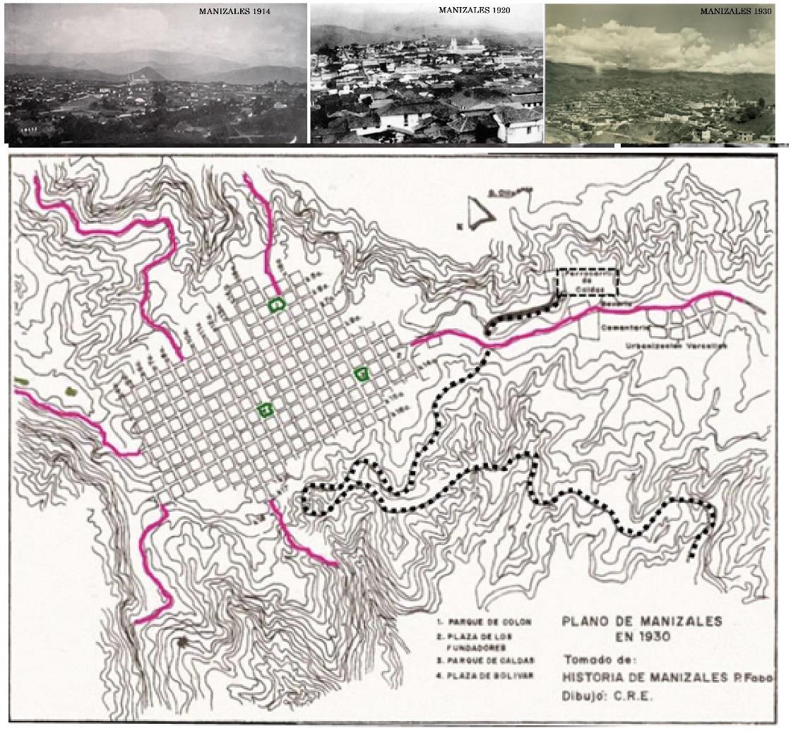 • Sismo, bahareque y laderas. Manizales- panorámicas de 1914 - 1920 y 1930- Y plano de Manizales de 1930 tomado del Padre Fabo.