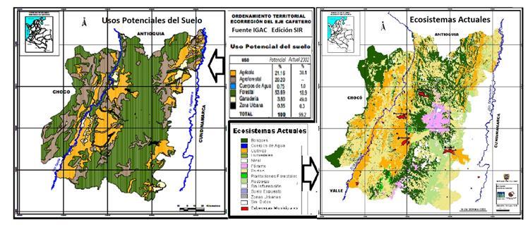 • Eje Cafetero: cambio climático y vulnerabilidad territorial. Ecorregión Eje Cafetero: usos potenciales y actuales del suelo al 2000 y Zonificación del agua. SIR-Alma Mater (2002).