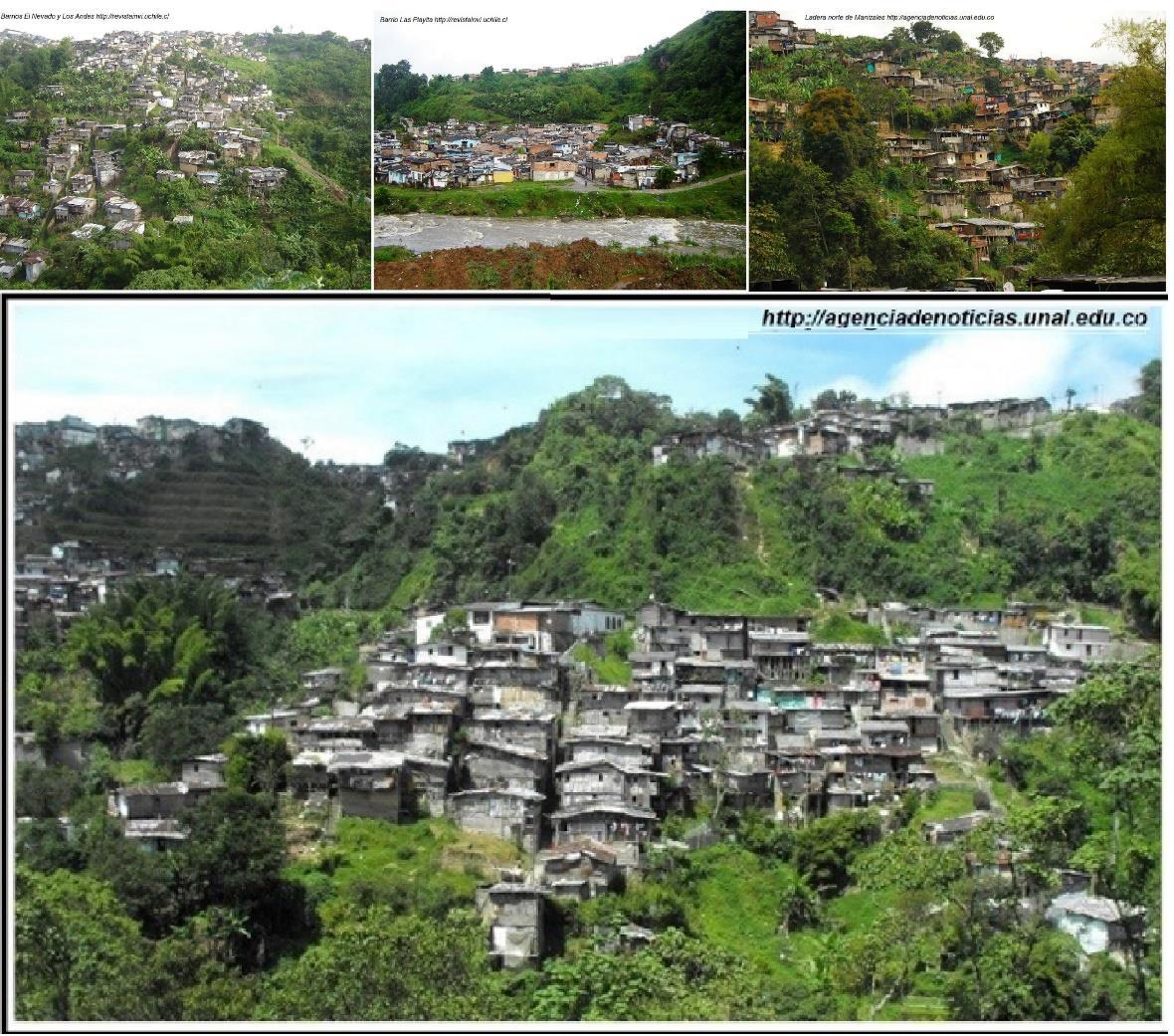 Vulnerabilidad por pasivos ambientales en las laderas de Manizales. Asentamientos en riesgo sobre las laderas del Sur y del Norte de la ciudad (Arriba). Y fragmento de la ladera de Olivares en la Comuna 2 de Manizales (Abajo). U de Chile y Agencia de Noticias UN.