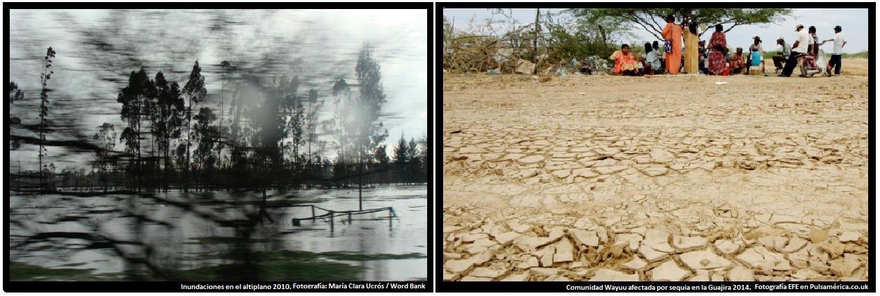 Durante El Niño, Colombia, y en particular las regiones Caribe y Andina y al norte de la región del Pacífico, presenta disminución pronunciada en las precipitaciones y la humedad. Contrariamente, durante “La Niña” Colombia presenta aumento considerable de precipitaciones y disminución de temperaturas en las regiones Andina, Caribe y Pacífica, y en el piedemonte de los Llanos Orientales. En la Orinoquía y Amazonía, dichas variables tienden a un comportamiento cercano a lo normal. En Colombia, mientras el 12% del territorio nacional se localiza en áreas de alta susceptibilidad a inundaciones, el 18% del territorio se encuentra en zonas de amenaza alta y muy alta por movimientos en masa.