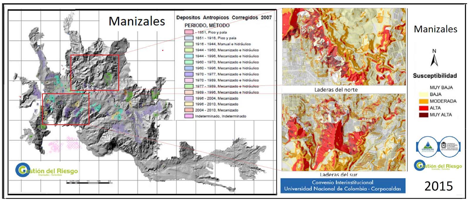 Pero si bien en amenazas como la volcánica y la sísmica para enfrentar dichos riesgos, los que ya conocemos por lo padecido con la erupción del Ruiz (1985) y el terremoto del Eje Cafetero (1999), se cuenta con una gestión e instrumentos consolidados e institucionalizados, en relación con la amenaza hidrogeológica, el panorama para Manizales cambia: debemos actuar tomando mejores decisiones, dados los desafíos del cambio climático en su medio tropical andino, por la fragilidad de estas laderas de cenizas volcánicas en un escenario rural deforestado y en el medio urbano degradado, sometidas a precipitaciones cada vez más intensas, con incrementos pluviométricos esperados de un 20% a un 40% del 2070 al 2100, según pronósticos del IDEAM.
