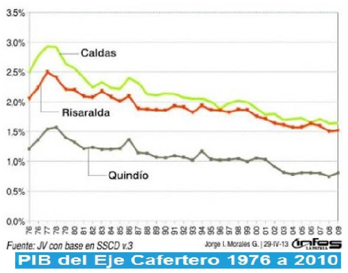 Imagen 4- entre 1976 y 2010, la participación del PIB del Eje Cafetero, cae del 6.5% al 3.8%. Jorge I Morales en La Patria.