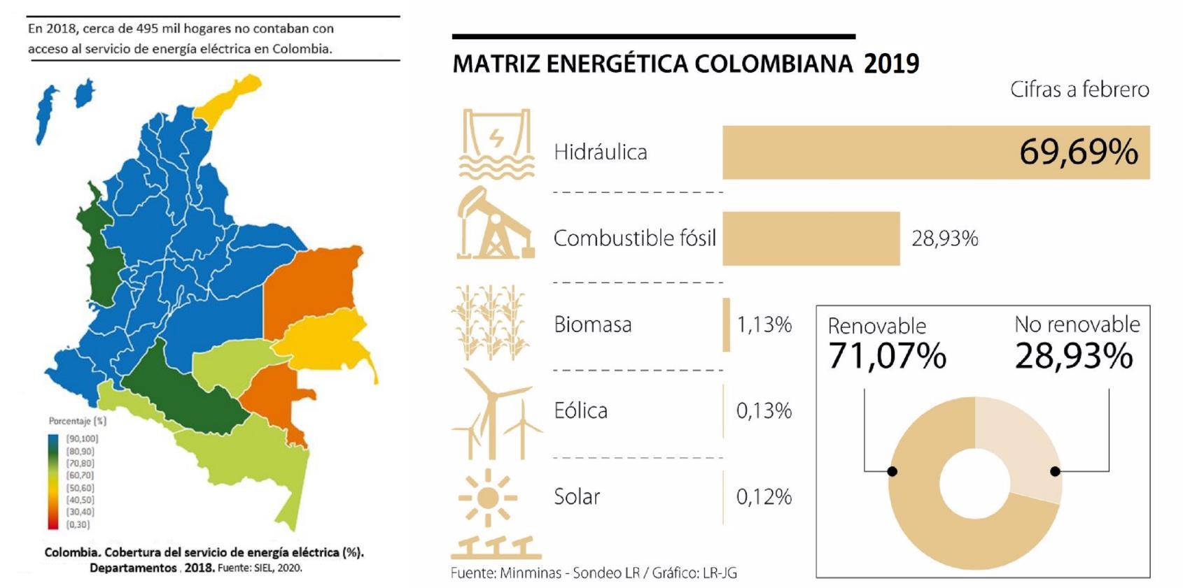 Portada: Energía Eléctrica en Colombia- cobertura 2018 (SIEL), y Matriz energética 2019 de Colombia, en La República.