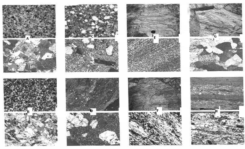 Figura 33. Anexos petrográficos. Se muestran aspectos al natural (Arriba) y al microscopio (Abajo) de diferentes rocas: A granito, B diorita, C pórfido, D basalto, E pizarra, F micaesquisto, G mármol, H gneis. Atlas de Geología. Durán-Gold-Taberner.