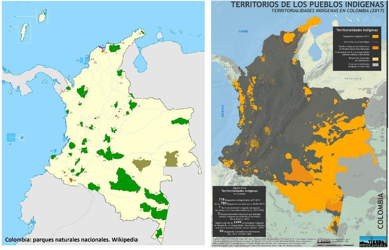 Imagen 43B: Parques Naturales Nacionales de Colombia (Wikipedia) y Territorios indígenas en Colombia al 2017 (geoactivismo.org).