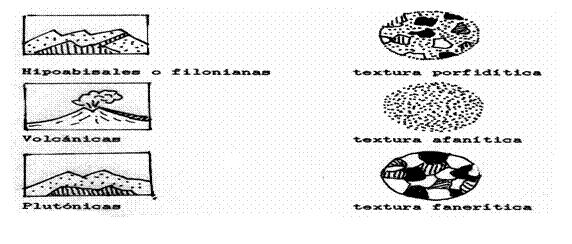 Figura 28. Ambientes de formación y texturas. A la izquierda se ilustran los ambientes de formación de las rocas ígneas y a la derecha las texturas de las rocas en cada ambiente. Adaptado de Leet y Judson