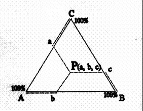 En el diagrama un punto P interior del triángulo es un compuesto que tiene tres coordenadas, a, b y c, leídas sobre cada uno de los lados del triángulo, tal que su suma sea 100%. El punto P (a, b, c) se localiza así: sobre CA marco a, por a trazo paralela al lado BC; sobre AB marco b, por b trazo paralela al lado AC, y sobre el lado BC marco c y por c trazo paralela al lado AB. Las tres paralelas se encuentran en un único punto p, cuando a+b+c=100%.