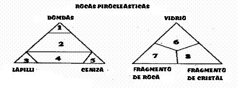 Figura 32. La clasificación de las rocas piroclásticas puede hacerse según el tamaño (izquierda) o la naturaleza de los constituyentes (derecha), así: 1. Brecha piroclástica, 2. Brecha tobácea, 3. Lapillistone, 4. Toba de lapilli, 5. Toba (tuff), 6. Tobas vítreas, 7. Tobas líticas, 8. Tobas cristalinas. Curso de petrología, J. L. Naranjo.