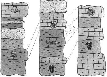Figura 47. Correlación de eventos con base en tres columnas estratigráficas. Los estratos contienen fósiles. Con línea punteada se enlazan estratos contemporáneos de lugares distantes. Tomado de La Tierra Planeta Vivo, Salvat.