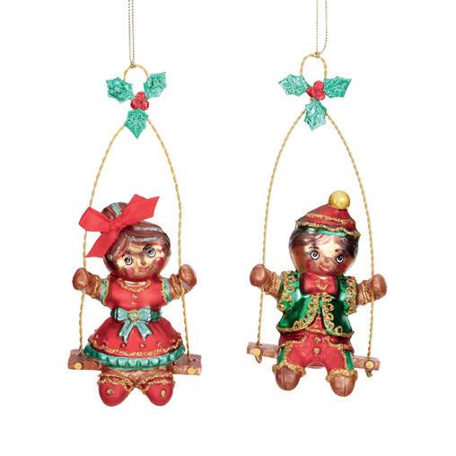 GLSS GINGERBR.COUPLE ON SWING ORN ASS/2 RD/GRN 15CM