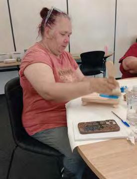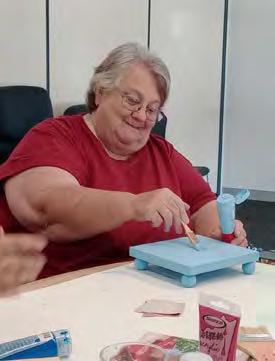 In February, our craft group created beautiful trivets for their pot plants. The ladies carefully sanded wooden blocks, glued four beads underneath to form the feet, and then painted and decorated each piece to suit their own style.