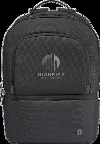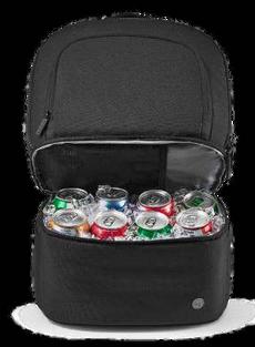 The 24-Can Highland Backpack Cooler is made from durable 600D material and features a zippered main compartment with heat sealed PEVA lining and a removable and cleanable clear insert. It also has a front pocket with buckles and magnetic snap closure, two side pockets, side D-rings, metal hardware, bottle opener and adjustable padded backpack straps.