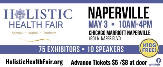 Cost: $5 in advance, $8 at the door; $25 for keynote includes admission, advanced sales only. Location: 1801 N. Naper Blvd., Naperville. For more information, to purchase tickets or to apply to exhibit, visit HolisticHealthFair.org See ad on page 14.