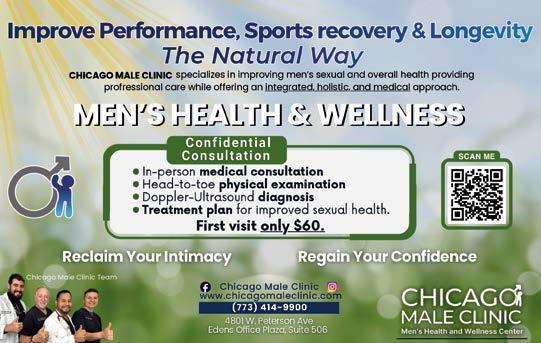 Chicago Male Clinic (CMC) is a holistic health and wellness center for men providing a natural integrated approach to improving men’s sexual health. CMC offers therapeutic massage, exercise and stretch therapy, men’s yoga classes, patient coaches and trainers. CMC offers a natural approach to treating erectile difficulties (ED) with its Acoustic Wave Therapy. Call for your complimentary, in-person consultation (valued at $225). Book your first appointment at ChicagoMaleClinic.com See ad on page 13.