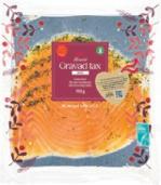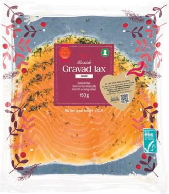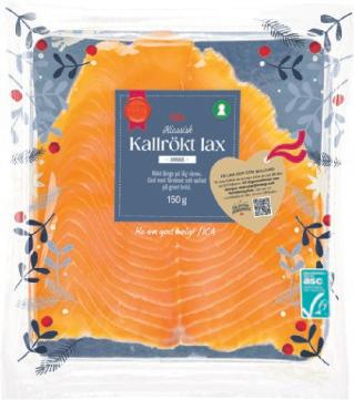Gravad, kallrökt, najad lax ICA. 150 g. Jfr pris 296:67/kg.