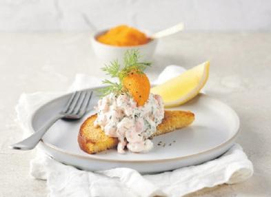 6. Servera skagenröran på bröden med löjrommen, citronklyftor och toppa med lite extra dill och nymalen svartpeppar.